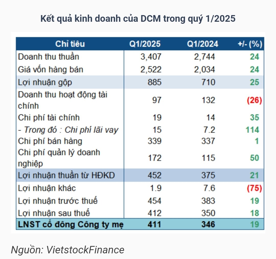 Công ty Cổ phần Phân bón Dầu khí Cà Mau (Đạm Cà Mau - HoSE: DCM) công bố báo cáo tài chính hợp nhất quý I/2025 với doanh thu thuần đạt 3.406,7 tỷ đồng, tăng 24% so với cùng kỳ. Trừ đi giá vốn, lãi gộp còn 885 tỷ đồng, tăng 25%.
