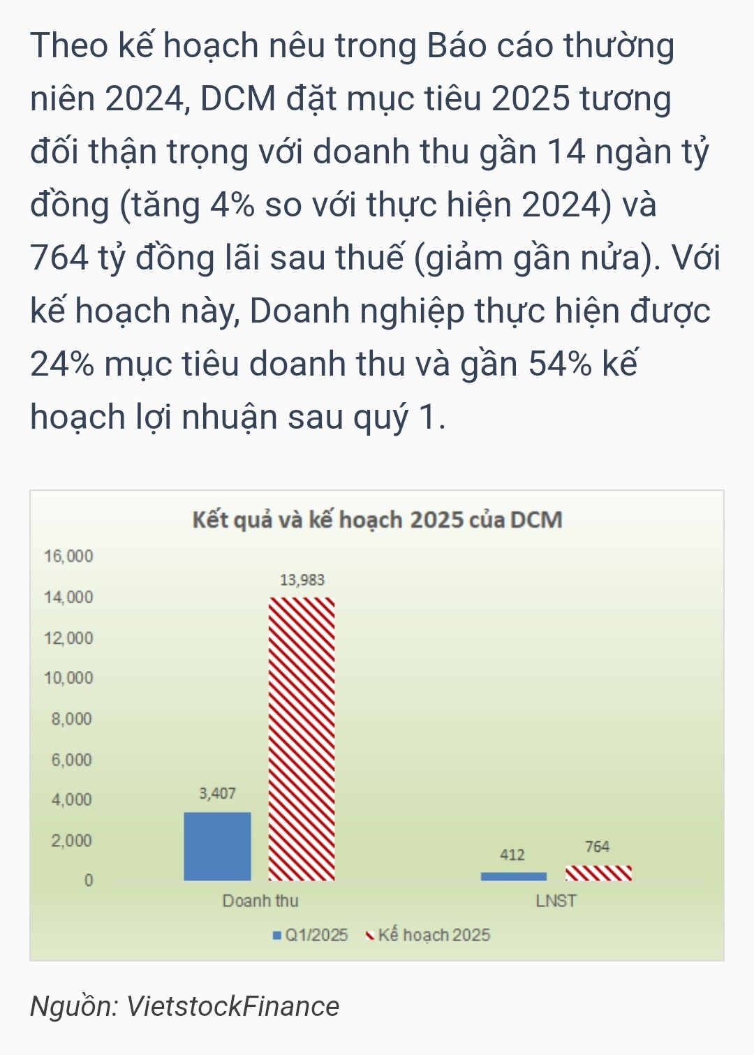 Theo kế hoạch nêu trong báo cáo thường niên 2024, Đạm Cà Mau đặt mục tiêu 2025 tương đối thận trọng với doanh thu gần 14.0000 tỷ đồng (tăng 4% so với thực hiện 2024) và 764 tỷ đồng lãi sau thuế. Với kế hoạch này, công ty thực hiện được 24% mục tiêu doanh thu và gần 54% kế hoạch lợi nhuận sau quý I.