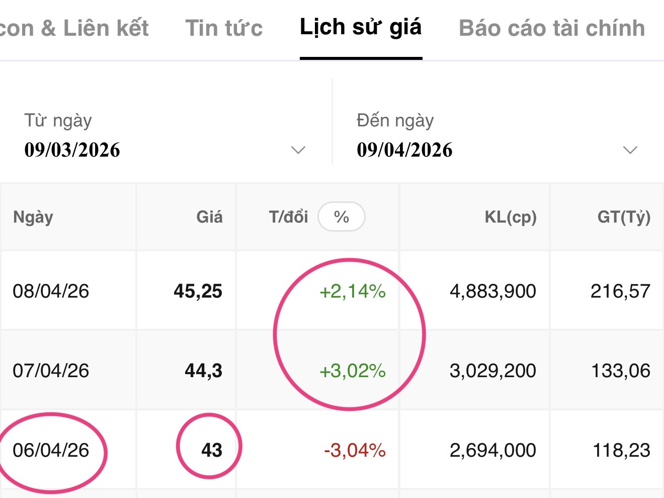 Nhặt DCM không được giá 43 vì phải chờ sang ngày 7/4/2026 mới có xiền nhặt, nhưng cũng được vùng 43.x là thấy tạm ổn để đó quan sát tiếp. Tăng lại vui và nếu có chỉnh giảm tiếp về vùng 42.x hay 43.x lại nhặt thêm để chờ ra BCTC quý 01/2026.