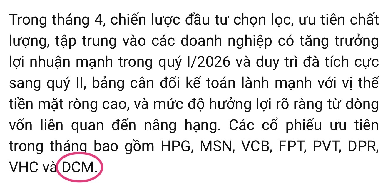 =>Các cổ phiếu ưu tiên trong tháng 4/2026 thì DCM là một trong số đáng quan tâm nhất.