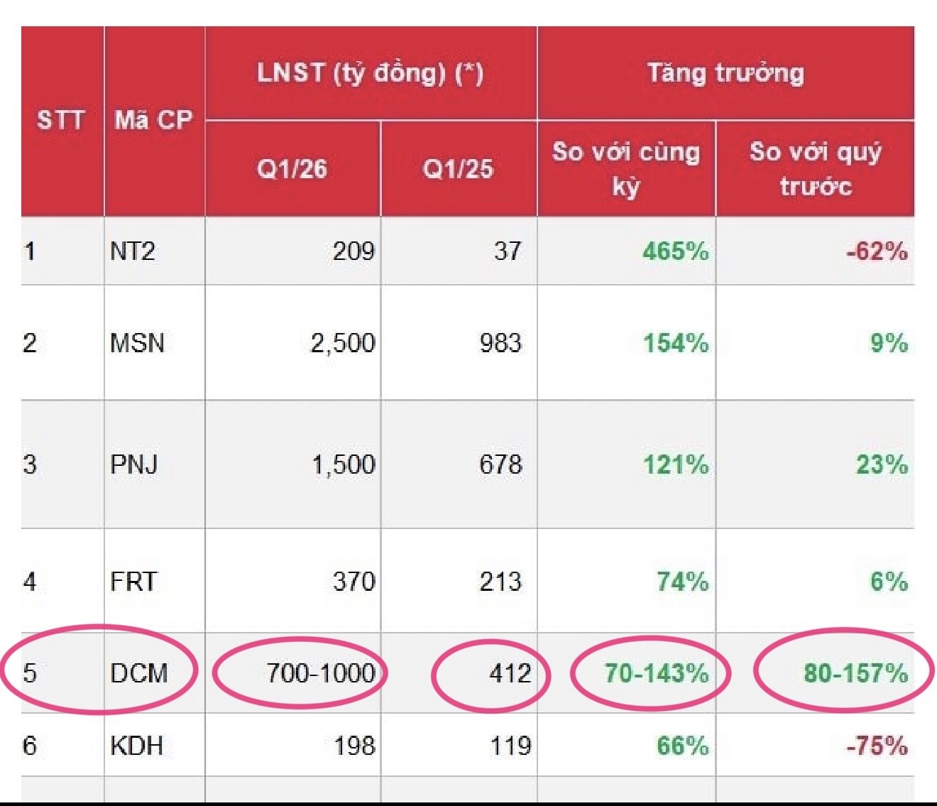 Đã có nhiều thông tin dự báo Lợi nhuận của DCM quý 01/2026 đạt trên dưới 1000 tỷ LNTT; tăng trưởng 3 con số so với cùng kỳ. (Quý 01/2025 LNTT của DCM là: 412 tỷ). Quá ấn tượng cho DCM