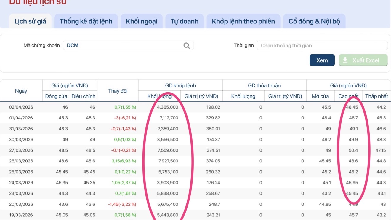 Cũng thấy tự tin cho nhịp tới khi đưa DCM vào tầm ngắm tuần tới (từ ngày 06 đến 10/4/2026)…. sau khi đưa ra nhận định và rồi quyết đoán múc DGC ở vùng 48.x đáy của đáy vài năm kết tuần DGC ngày 3/4/2026 cũng đã có giá 56.5
