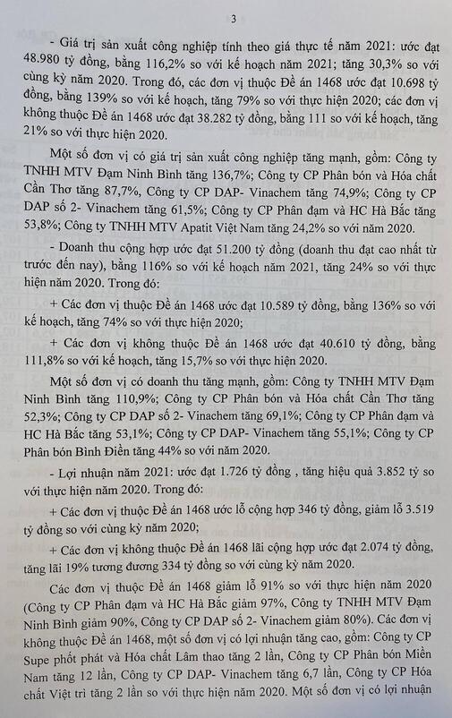 Vinachem: Hội nghị tổng kết năm 2021, triển khai nhiệm vụ năm 2022 Nguyễn Hương 09:24 SA @ Thứ Sáu - 07 Tháng Giêng, 2022 Ngày 06/01/2022, Tập đoàn Hóa chất Việt Nam (Vinachem) đã tổ chức Hội nghị tổng kết nhằm đánh giá tình hình thực hiện nhiệm vụ năm 2021 và triển khai phương hướng thực hiện trong năm 2022. Tới dự và chỉ đạo Hội nghị có các đồng chí : Nguyễn Đình Khang - UVTWĐ - Chủ tịch Tổng Liên đoàn Lao động Việt Nam; Hồ Sỹ Hùng - Phó Chủ tịch UBQLVNN tại doanh nghiệp; cùng đại diện Bộ Công thương, Ủy Ban kiểm tra Trung ương, Văn phòng Chính phủ, … Năm 2021, các đơn vị thuộc Tập đoàn Hóa chất Việt Nam (Vinachem) tiếp tục đối mặt với nhiều khó khăn, thách thức trong triển khai thực hiện nhiệm vụ. Đó là khó khăn từ đại dịch Covid-19 gây ảnh hưởng nghiêm trọng đến mọi mặt công tác. Các yếu tố như giá nguyên liệu đầu vào tăng cao, thiếu hụt nguồn cung nguyên liệu, Luật số 71/2014/QH13 vẫn ảnh hưởng trực tiếp đến tình hình hoạt động sản xuất kinh doanh của toàn Tập đoàn. Bên cạnh đó, việc cân đối nguyên liệu đầu vào, vốn và điều kiện sản xuất, cũng như thị trường tiêu thụ sản phẩm cũng là khó khăn lớn đối với Vinachem. Song với sự chỉ đạo quyết liệt, đồng bộ, kịp thời và có hiệu quả của Tập đoàn ở mọi mặt công tác, Vinachem đã đạt kết quả khả quan trong năm 2021, cụ thể: Giá trị sản xuất công nghiệp tính theo giá thực ước đạt 48.980 tỷ đồng, bằng 116,2% kế hoạch năm, tăng 30,3 so với năm 2020. Trong đó : các đơn vị không thuộc Đề án 1468 ước đạt 38.282 tỷ đồng, bằng 111 so với kế hoạch, tăng 21% so với thực hiện 2020; các đơn vị thuộc Đề án 1468 ước đạt 10.698 tỷ đồng, bằng 139% so với kế hoạch, tăng 79% so với thực hiện 2020. Một số đơn vị có giá trị sản xuất công nghiệp tăng mạnh, gồm: Công ty TNHH MTV Đạm Ninh Bình tăng 136,7%; Công ty CP Phân bón và Hóa chất Cần Thơ tăng 87,7%; Công ty CP DAP- Vinachem tăng 74,9%; Công ty CP DAP số 2- Vinachem tăng 61,5%; Công ty CP Phân đạm và HC Hà Bắc tăng 53,8%; Công ty TNHH MTV Apatit Việt Nam tăng 24,2% so với năm 2020. Doanh thu toàn Tập đoàn ước đạt 51.200 tỷ đồng, bằng 116% kế hoạch năm, tăng 24% so với năm 2020. Trong đó: các đơn vị không thuộc Đề án 1468 ước đạt 40.610 tỷ đồng, bằng 111,8% so với kế hoạch, tăng 15,7%; các đơn vị thuộc Đề án 1468 ước đạt 10.589 tỷ đồng, bằng 136% so với kế hoạch, tăng 74% so với thực hiện 2020. Một số đơn vị có doanh thu tăng mạnh, gồm: Công ty TNHH MTV Đạm Ninh Bình tăng 110,9%; Công ty CP Phân bón và Hóa chất Cần Thơ tăng 52,3%; Công ty CP DAP số 2- Vinachem tăng 69,1%; Công ty CP Phân đạm và HC Hà Bắc tăng 53,1%; Công ty CP DAP- Vinachem tăng 55,1%; Công ty CP Phân bón Bình Điền tăng 44% so với năm 2020. Năm 2021, Vinachem đã thực hiện nộp ngân sách nhà nước đạt 1.668 tỷ đồng. Thu nhập bình quân của người lao động đạt 12,02 triệu đồng/ người/ tháng, tăng 32% so với cùng kỳ năm 2020. Lợi nhuận cộng hợp toàn Tập đoàn đạt 1.726 tỷ đồng. Một số đơn vị có lợi nhuận tăng cao, gồm: Công ty CP Supe Phốt phát và Hóa chất Lâm Thao tăng gấp 2 lần; Công ty CP Phân bón Miền Nam tăng 12 lần; Công ty CP DAP-Vinachem tăng 6,7 lần; Công ty CP Hóa chất Việt Trì tăng 2 lần so với thực hiện năm 2020. Trong năm, Tập đoàn đã sản xuất và cung ứng cho thị trường 3,534 triệu tấn phân bón các loại; 3,6 triệu chiếc lốp ô tô; 2,16 triệu kWh ắc quy; gần 253 nghìn tấn chất giặt rửa và nhiều sản phẩm hoá chất phục vụ cho nhu cầu sản xuất và đời sống xã hội. Bên cạnh đó, tổng kim ngạch xuất nhập khẩu đạt 716,8 triệu USD, đạt 147% so với kế hoạch năm. Trong đó tổng giá trị xuất khẩu đạt 404,2 triệu USD, tăng 34% so với năm 2020; nhập khẩu đạt 312,6 triệu USD, tăng 71% so với năm 2020. Đối với công tác đầu tư xây dựng, giá trị thực hiện trong năm 2021 đạt 388 tỷ đồng, bằng 67,2% kế hoạch đầu tư xây dựng của năm. Trong năm, Tập đoàn đã thực hiện ý kiến chỉ đạo của các cấp thẩm quyền về việc quyết toán các hợp đồng thuộc dự án Khai thác và Chế biến Muối mỏ tại Lào. Hiện Tập đoàn đang phối hợp chặt chẽ với Công ty TNHH Hóa chất và Muối Mỏ Việt Lào làm việc với các Nhà thầu để thực hiện việc quyết toán, thanh lý các hợp đồng, … Bên cạnh đó, Tập đoàn đang tích cực triển khai phương án xử lý dự án theo ý kiến chỉ đạo của cấp có thẩm quyền đối với dự án này. Đối với Dự án xây dựng Nhà máy Lân Văn Điển tại Thanh Hóa (của Công ty CP Phân lân nung chảy Văn Điển): Dự án được cấp có thẩm quyền cho phép giãn tiến độ để thực hiện đánh giá lại hiệu quả làm cơ sở để báo cáo, đề xuất cấp có thẩm quyền việc triển khai các bước tiếp theo của dự án. Đối với Dự án đầu tư sản phẩm mới gốc Clo (của Công ty CP Hóa chất Việt Trì): Công ty CP Hóa chất Việt Trì đã hoàn thành công tác phê duyệt báo cáo nghiên c