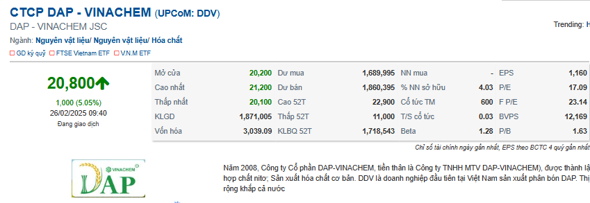 DDV được kỳ vọng duy trì nền tảng tăng trưởng nhờ các yếu tố như nhu cầu tiêu thụ phân bón cải thiện khi bước vào mùa vụ Đông Xuân và chính sách hạn chế xuất khẩu của Trung Quốc (tới hết quý I/2025). Cùng với đó, DAP - Vinachem hưởng lợi từ chính sách thuế VAT thay đổi theo hướng tích cực.