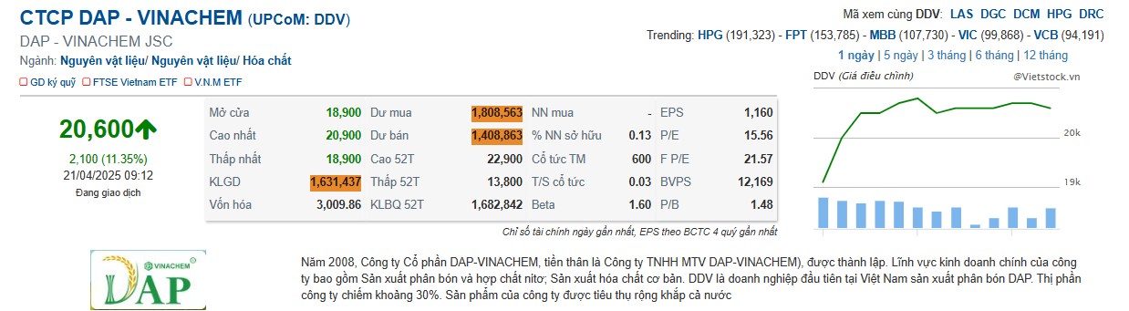 Mấy cổ phiếu phân bón như BFC, LAS, DDV đặc điểm chung là BCTC quý 1 đều tích cực. Hành động giá cũng phản ánh kỳ vọng khả quan cổ phiếu đã bật tăng mạnh trở lại và về lại giá trước khi có thông tin thuế quan. DDV thì khoẻ nhất trong số đó. Giá hiện tại tích luỹ quanh vùng 20± trước khi chạy tiếp.