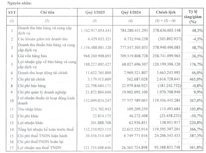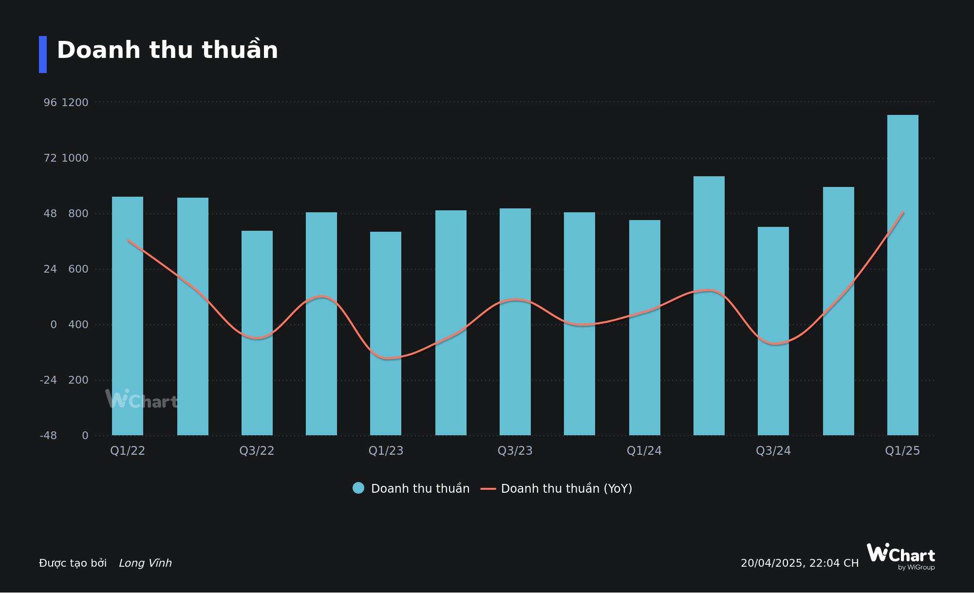 Quý 1/2025 đánh dấu một bước tiến vượt bậc trong hoạt động kinh doanh của công ty. Doanh thu thuần ghi nhận con số kỷ lục, lần đầu tiên vượt ngưỡng 1.000 tỷ đồng/quý – mức cao nhất kể từ khi công ty chính thức niêm yết trên sàn chứng khoán.