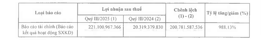 Lợi nhuận kế toán sau thuế TNDN quý III/2025 lãi với số tiền 221.100 triệu đồng, tăng so với cùng kỳ năm trước với số tiền 200.781 triệu đồng, tương ứng với tỷ lệ tăng 988% là do: