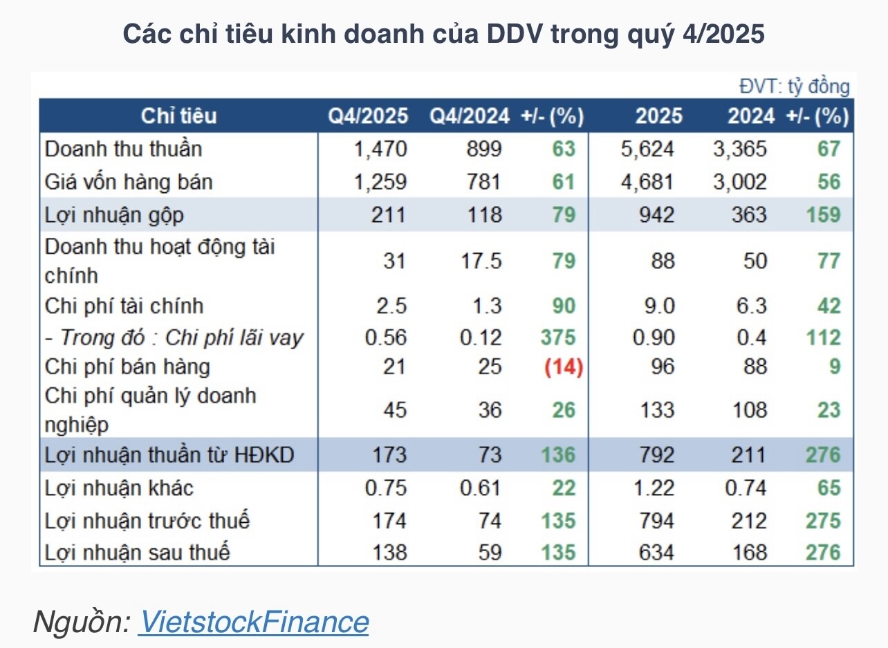 =>DDV lập kỷ lục lợi nhuận, tiền gửi ngân hàng gấp đôi nợ. Nhìn vào các chỉ tiêu mà DDV đạt được quý 4/2025 và cả năm 2025 so với cùng kỳ cho thấy hứa hẹn năm 2026 lại tươi sáng…