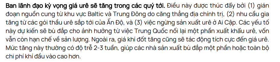 Cũng như ban lãnh đạo của DCM, mình cũng nghĩ giá phân Ure sẽ tăng trong thời gian tới và cục diện sẽ xoay chuyển về phía có lợi cho DPM và DCM