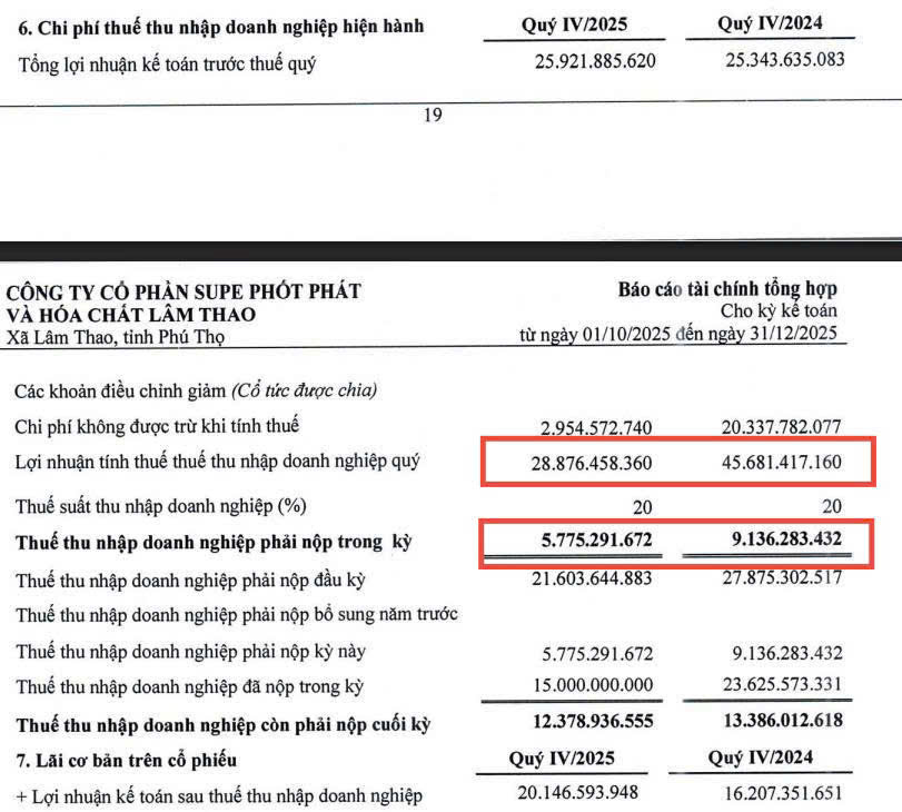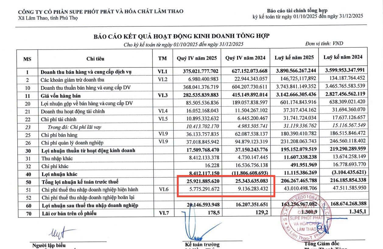 Lợi nhuận trước thuế quý 4 năm nay gần như đi ngang so với cùng kỳ, quanh mức 25–26 tỷ đồng. Tuy nhiên, lợi nhuận sau thuế đạt khoảng 20 tỷ đồng, tăng khoảng 25% so với năm trước.