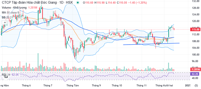 Xét về kỹ thuật, sau khi tạo đáy thành công ở vùng 107.x thì DGC có phiên break khá ấn tượng ngày 6/12 vừa qua. Chúng tôi cho rằng giá cổ phiếu sẽ duy trì ở mức 112.x – 115.x trước khi hướng tới vùng đỉnh cũ khi có các thông tin tích cực về việc khởi công nhà máy tại Nghi Sơn trong Q1/25.