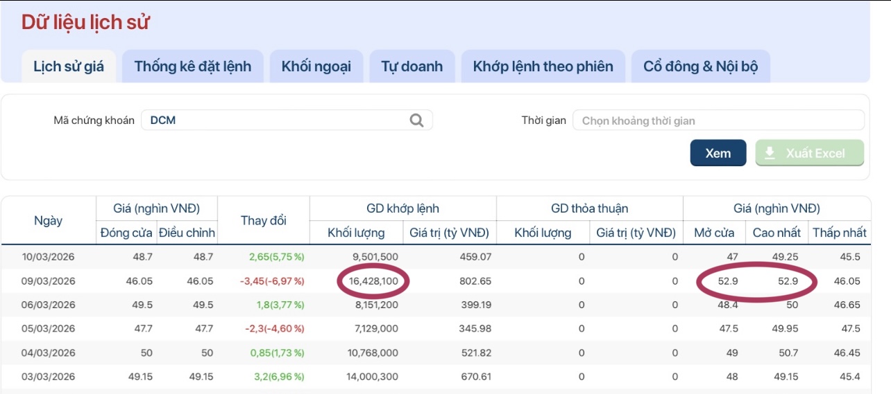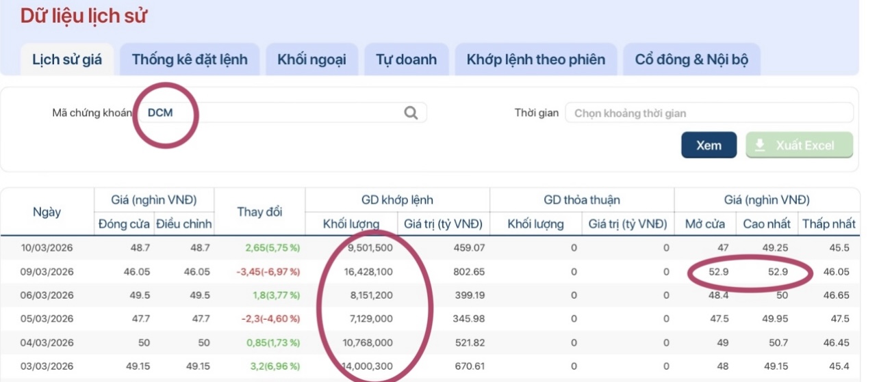 Vào DCM thời điểm này là khá an toàn và có cơ tăng mạnh vì phiên ngày 09/3/2026, có khối lượng khớp lệnh lượng cổ phiếu khổng lồ gần 16,5 triệu cổ trao tay. Phiên hôm đó lượng lớn cổ phiếu đua giá Ce tím trần 52.900 đồng/cổ. Và đáng quan tâm hơn nữa là 5, 6 phiên gần đây liên tục giao dịch với khối lượng lớn trên dưới giá 49.