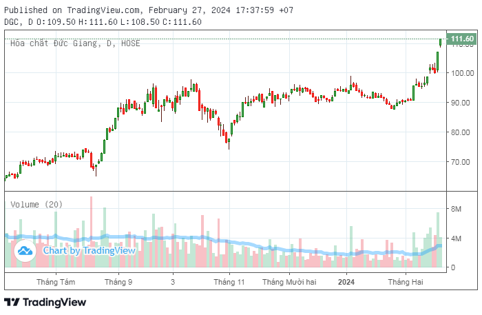 Sau phiên tăng trần ngày hôm trước, cổ phiếu DGC của Hoá chất Đức Giang đã tăng tiếp 4,3% trong phiên giao dịch ngày 27/2, đóng cửa tại mốc 111.600 đồng. Đây cũng là mức đỉnh cao nhất của cổ phiếu này trong 20 tháng qua, kể từ tháng 6/2022.