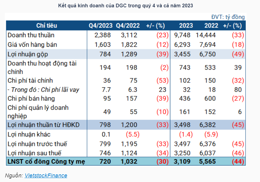Trong năm 2023 vừa qua, Công ty Cổ phần Hóa chất Đức Giang (mã cổ phiếu DGC - sàn HoSE) ghi nhận 9.748 tỷ đồng doanh thu thuần và 3.250 tỷ đồng lãi ròng, lần lượt giảm 33% và 46% so với năm 2022. So với kế hoạch cả năm, Hóa chất Đức Giang hoàn thành gần 90% mục tiêu doanh thu nhưng đạt 104% mục tiêu lợi nhuận.