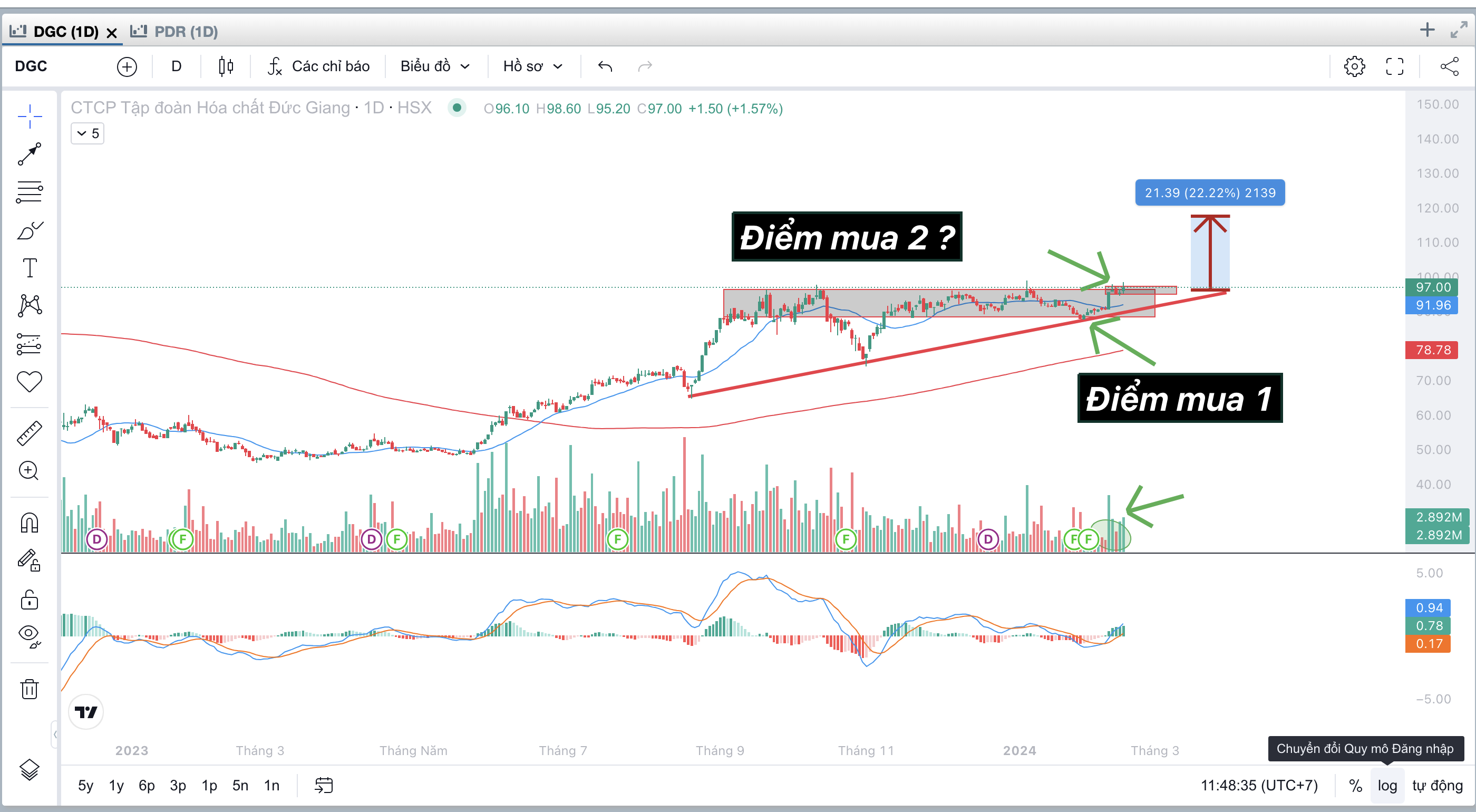 Giá cổ phiếu đang hợp lý với giá trị hiện tại, rủi ro chiết khấu khi thị trường chung đảo chiều mạnh. Case DGC là case kỳ vọg vào tương lai với các câu chuyện mở rộng