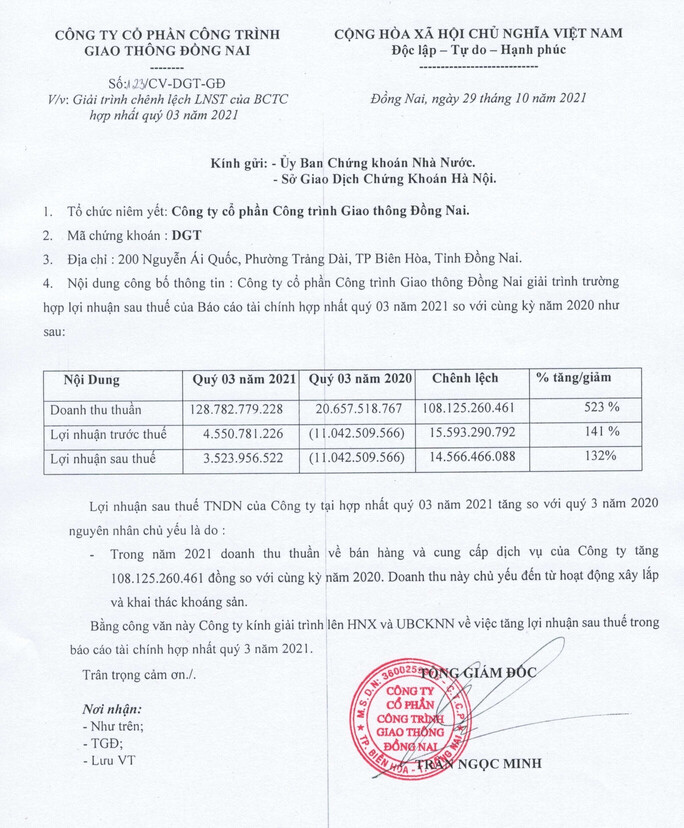 Về kết quả kinh doanh, năm 2020, tổng tài sản của DGT đạt 1,218 tỷ đồng; vốn chủ sở hữu là 256.2 tỷ đồng. Doanh nghiệp ghi nhận doanh thu 668.95 tỷ đồng; lợi nhuận sau thuế đạt 88.158 tỷ đồng. Với kinh nghiệm lâu năm cùng tầm nhìn mang tính chiến lược cao, CTCP Công Trình Giao Thông Đồng Nai (DGT) đã tận dụng tốt cơ hội từ đầu tư công và chiến lược M&A để thúc đẩy tăng trưởng, sẽ sớm hiện thực hóa cụ thể chiến lược kinh doanh trong giai đoạn " bình thường mới".