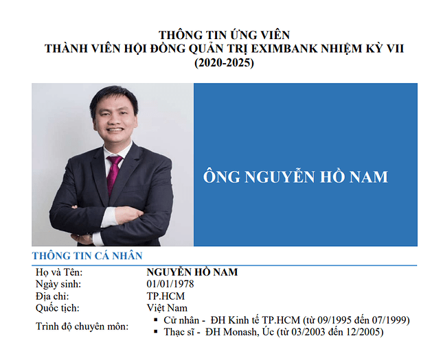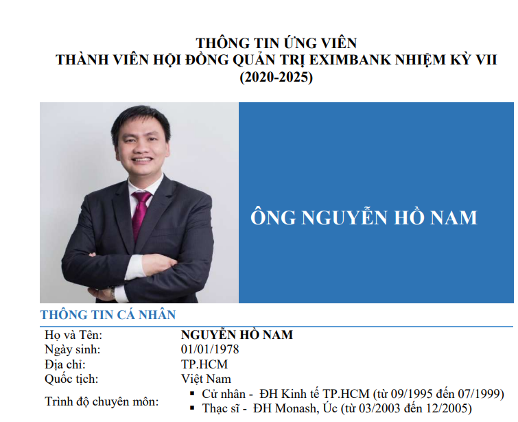 Eximbank bầu bổ sung 1 thành viên HĐQT nhiệm kỳ VII (2020-2025) theo danh sách ứng viên được Ngân hàng Nhà nước chấp thuận. Theo đó, ứng viên được bầu bổ sung là ông Nguyễn Hồ Nam - Chủ tịch CTCP Bamboo Capital. Ông Nam cũng đang đồng thời giữ chức vụ Chủ tịch tại CTCP Bamboo Energy, Thành viên HĐQT tại Quản lý quỹ Fides Việt Nam.