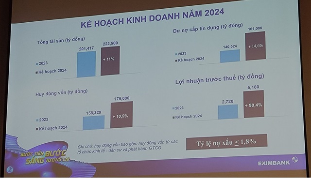 Với số vốn tăng thêm, năm 2024, Eximbank đặt mục tiêu lợi nhuận trước thuế đạt 5,180 tỷ đồng, tăng đến 90% so với kết quả 2023. Dự kiến đến cuối năm 2024, tổng tài sản đạt 223,500 tỷ đồng, tăng 11% so với đầu năm. Huy động vốn và dư nợ tín dụng đạt lần lượt 175,000 tỷ đồng và 161,000 tỷ đồng, tăng 10.5% và 14.6%. Tỷ lệ nợ xấu được kiểm soát ở mức 1.8%.