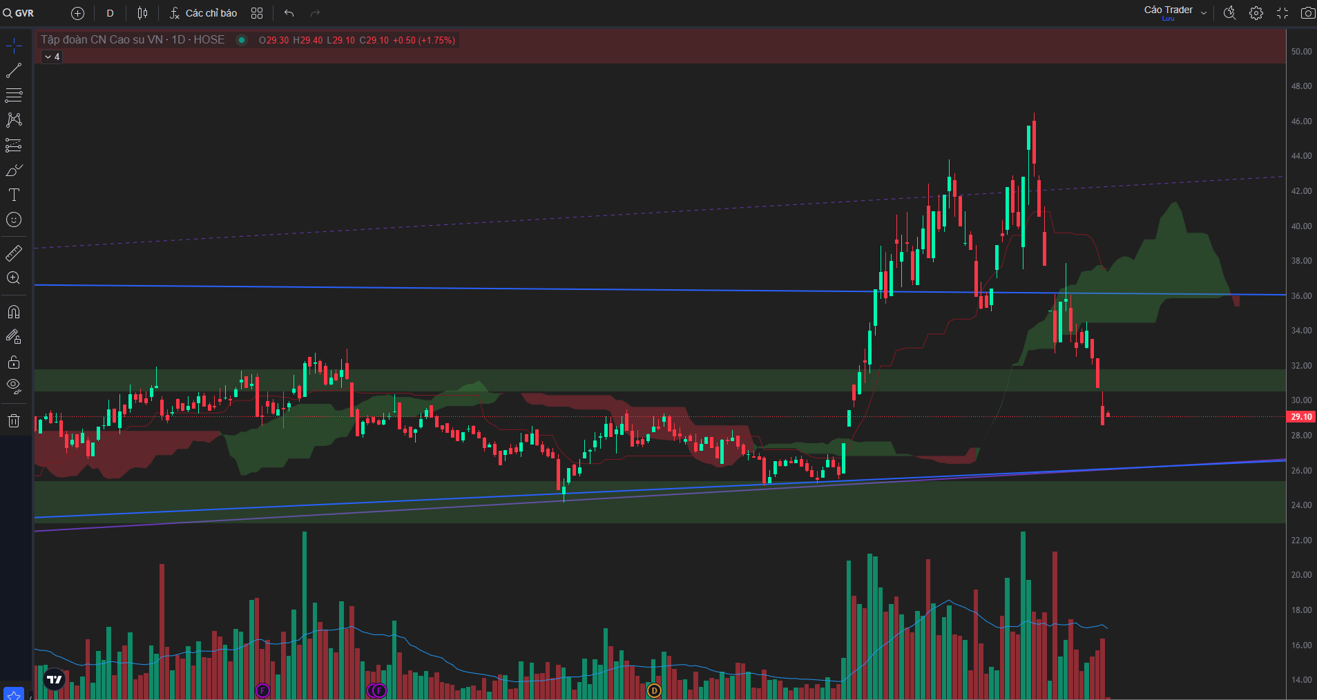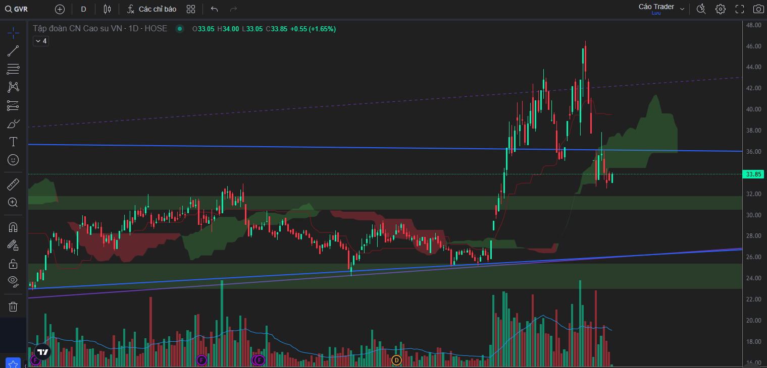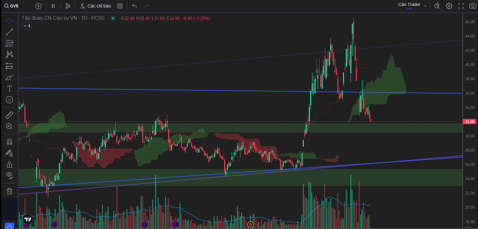 Xét về cấu trúc xu hướng, GVR đã chính thức đánh mất uptrend ngắn hạn khi gãy vùng hỗ trợ quan trọng 31–32, đồng thời liên tục hình thành các lower high – lower low. Giá hiện nằm dưới mây Ichimoku và chưa có dấu hiệu lấy lại vùng cân bằng trước đó, cho thấy xu hướng ngắn hạn vẫn nghiêng hoàn toàn về phía bên bán. Đây là giai đoạn mà bất kỳ quyết định mua nào nếu không có tín hiệu xác nhận đều mang tính “đoán đáy” hơn là giao dịch có hệ thống.