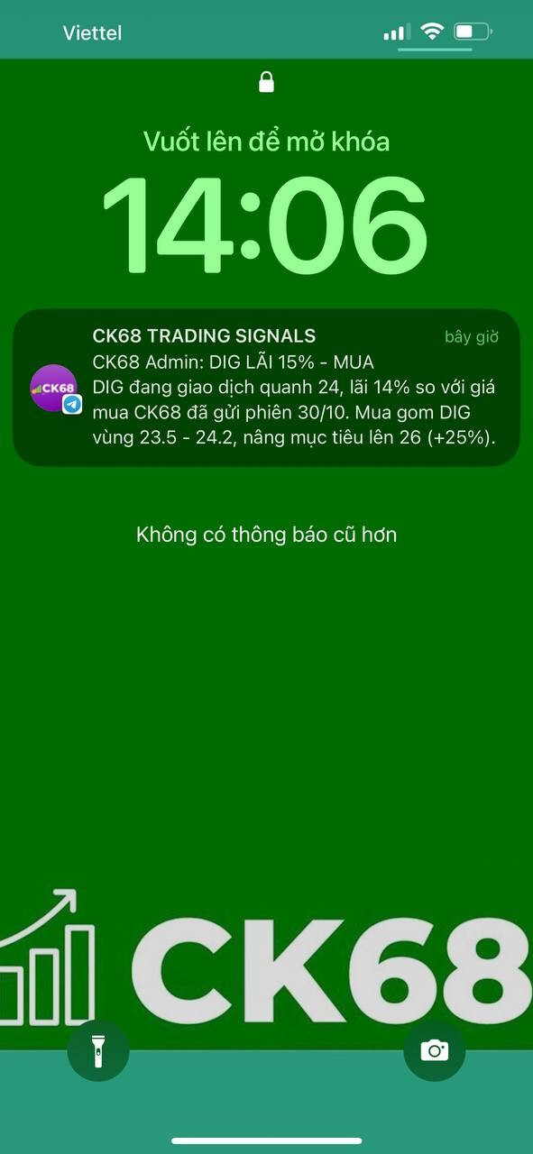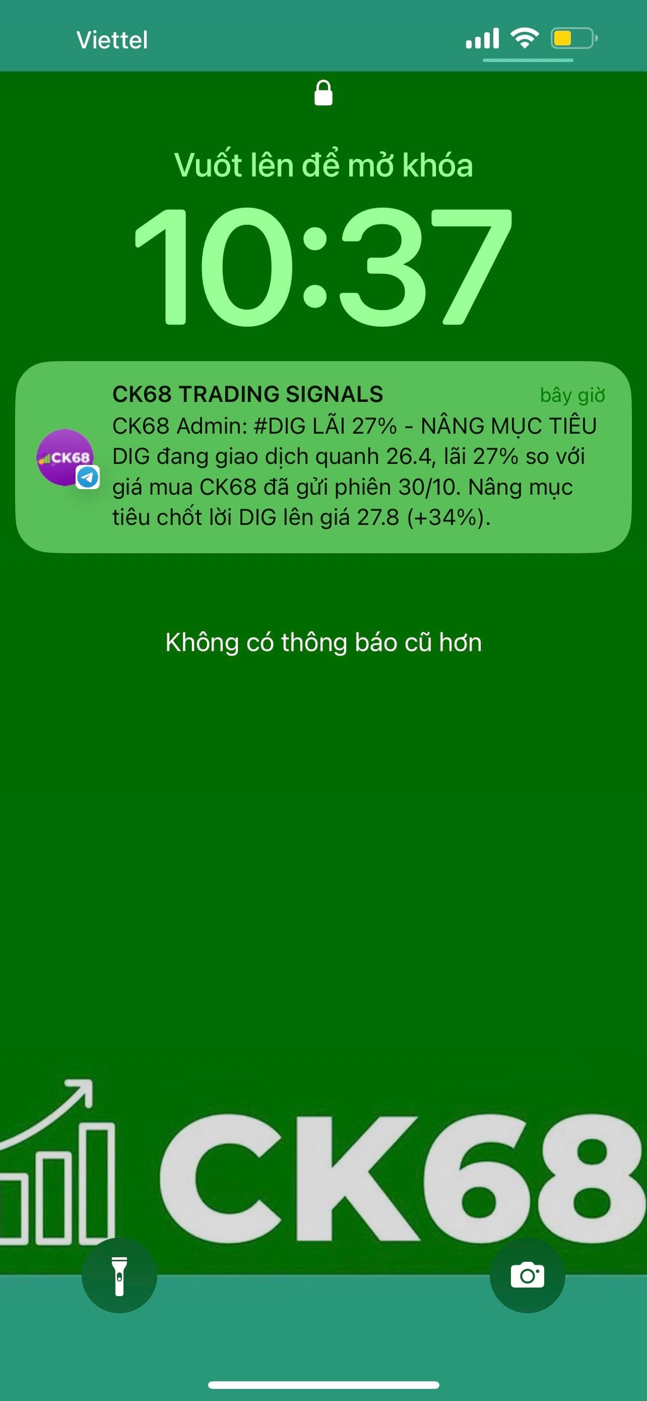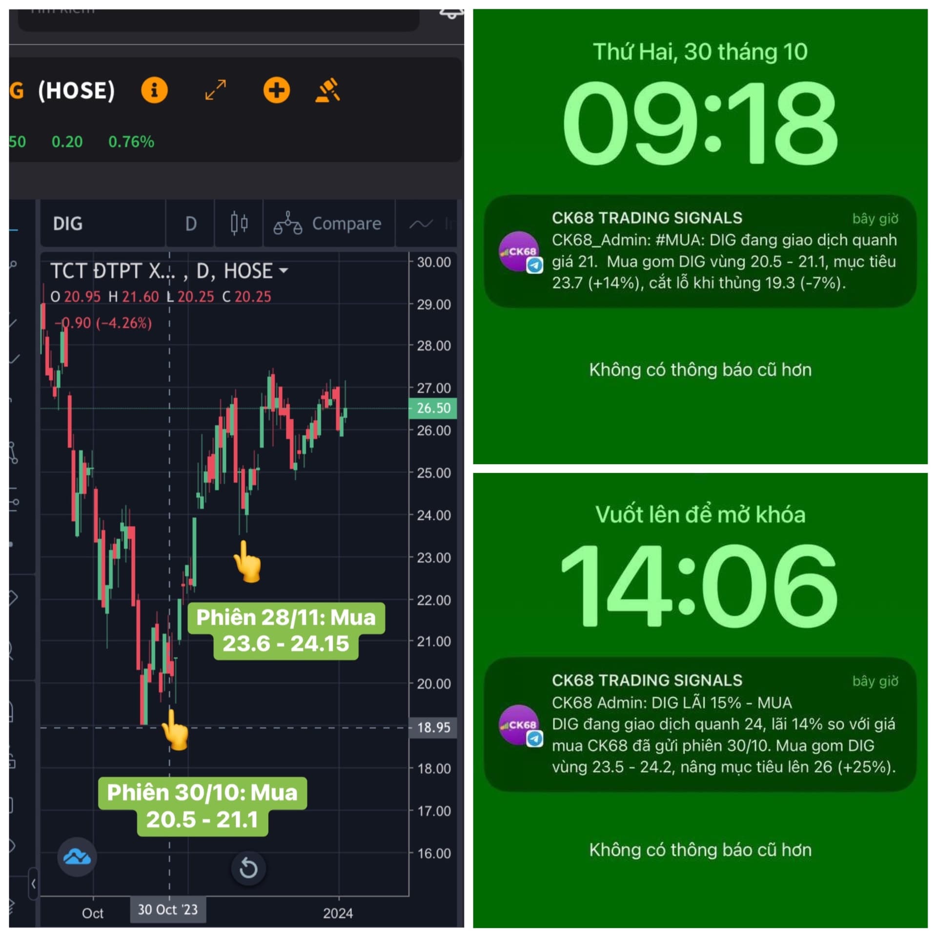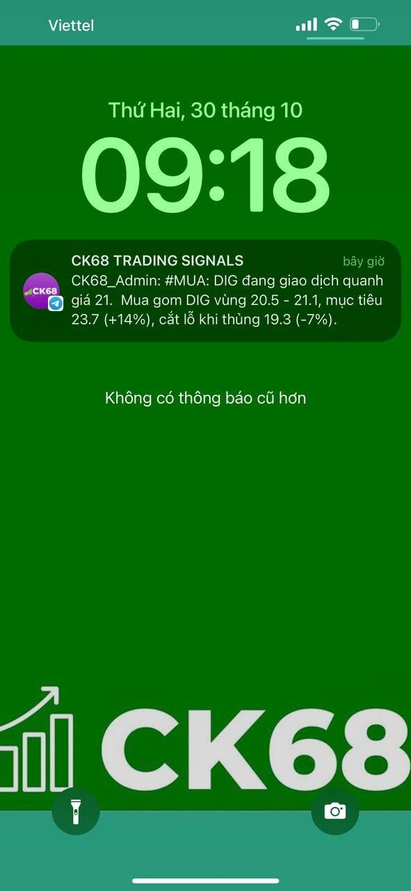 Vào lúc 9h18 phút phiên 30/10, khi DIG đang giao dịch quanh giá 21, CK68 đã gửi tín hiệu mua vùng 20.5 - 21.1 kỳ vọng lãi 14%