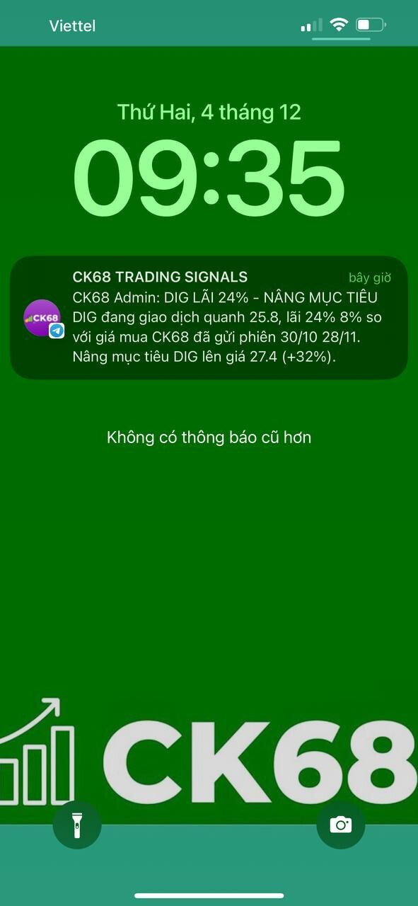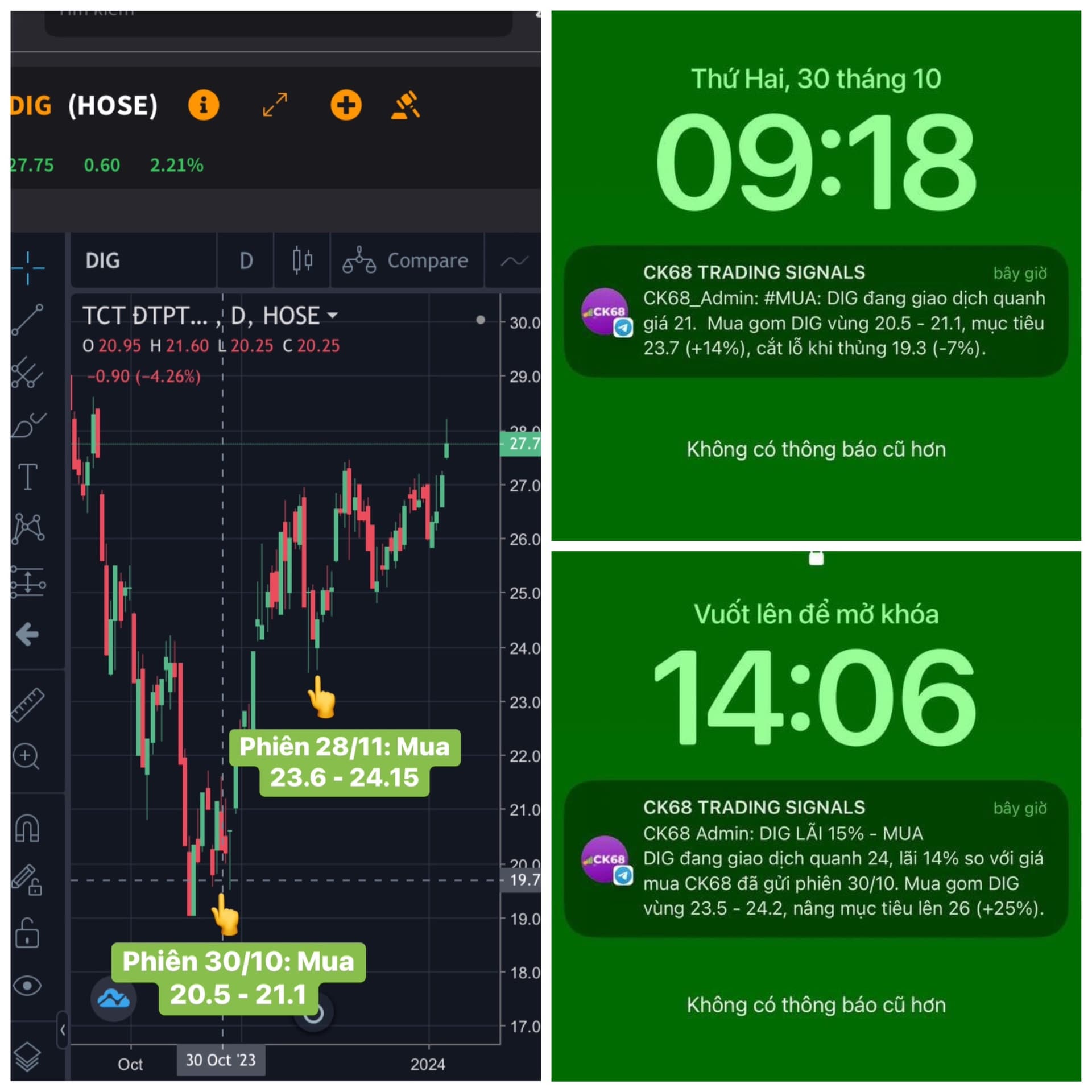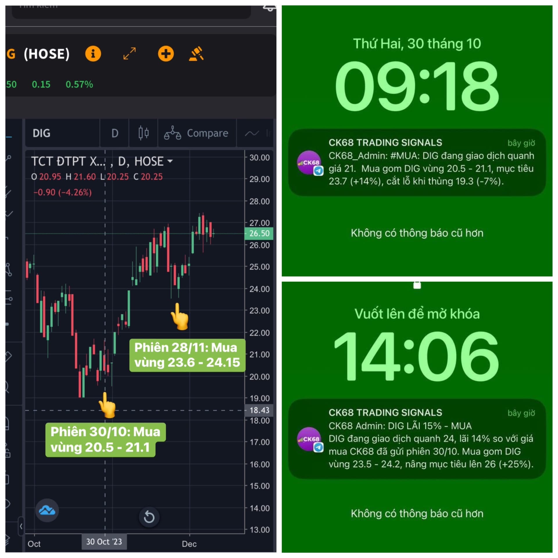 Phiên 12/12, khi DIG giao dịch quanh giá 26.5, CK68 đã gửi tín hiệu nắm giữ, tạm lãi 27%, 11% so với giá mua CK68 gửi các phiên 30/10, 28/11