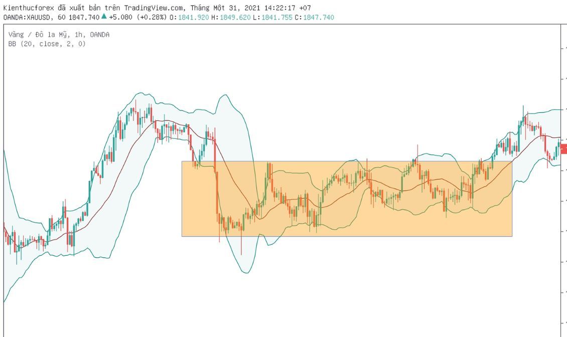 Dải Bollinger Bands thu hẹp lại khi thị trường Sideway và mở rộng khi xu hướng đang phát triển. Khi bạn thấy dải thu hẹp, đó có thể là dấu hiệu của Sideway.