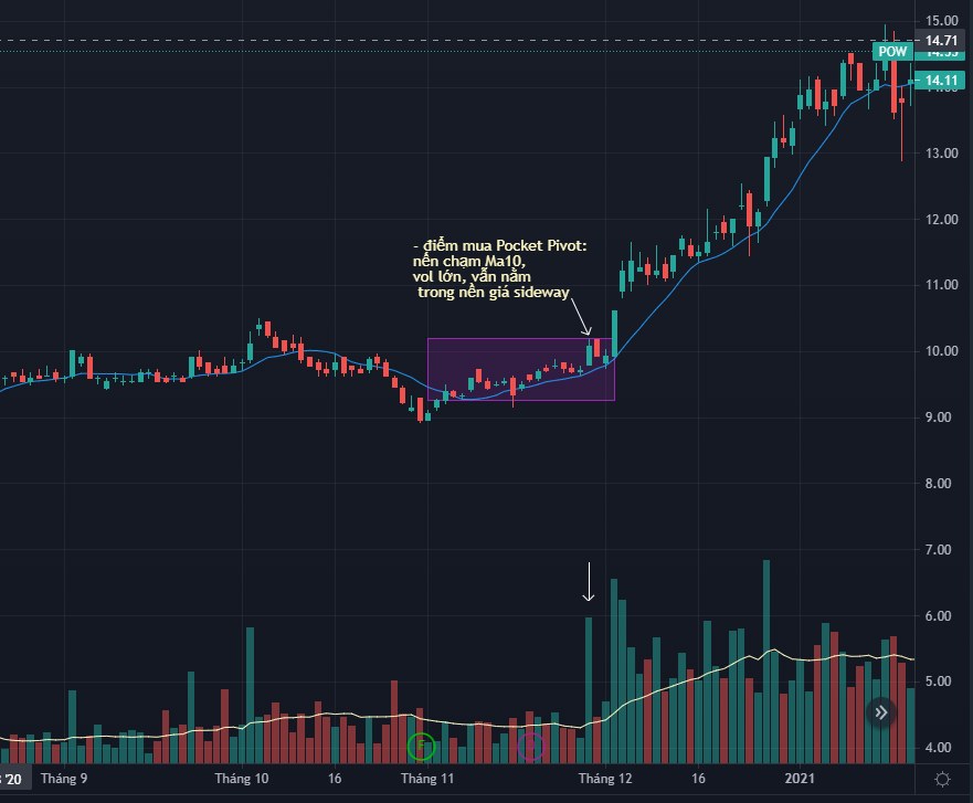 Thường nến pocket pivot ở gần so với đường trung bình MA10, kết phiên ở mức giá cao nhất trong ngày