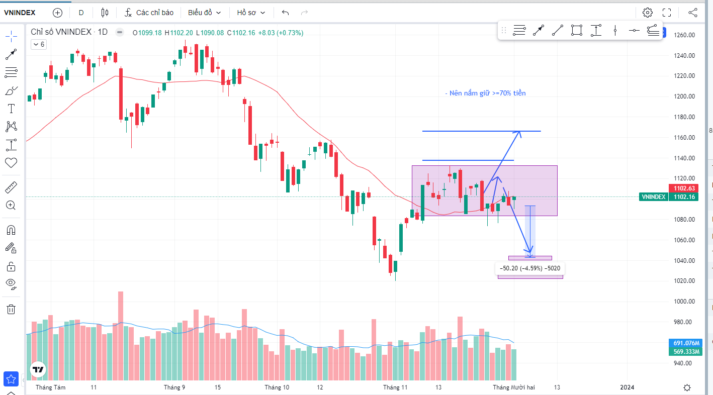Nhìn chart 1D, Vnindex vẫn nắm dưới ma20 nhìn tổng quán hơn thì xu hướng chính vẫn là sideway ( đi ngang ) trong biên độ 1080-1130 kể từ đầu tháng 11 trở lại đây. Chỉ số chỉ có rủi ro về dưới 1040 khi gãy 1080, nếu như vẫn nằm trong biên trên thì chẳng có căn cứ khẳng định gì.
