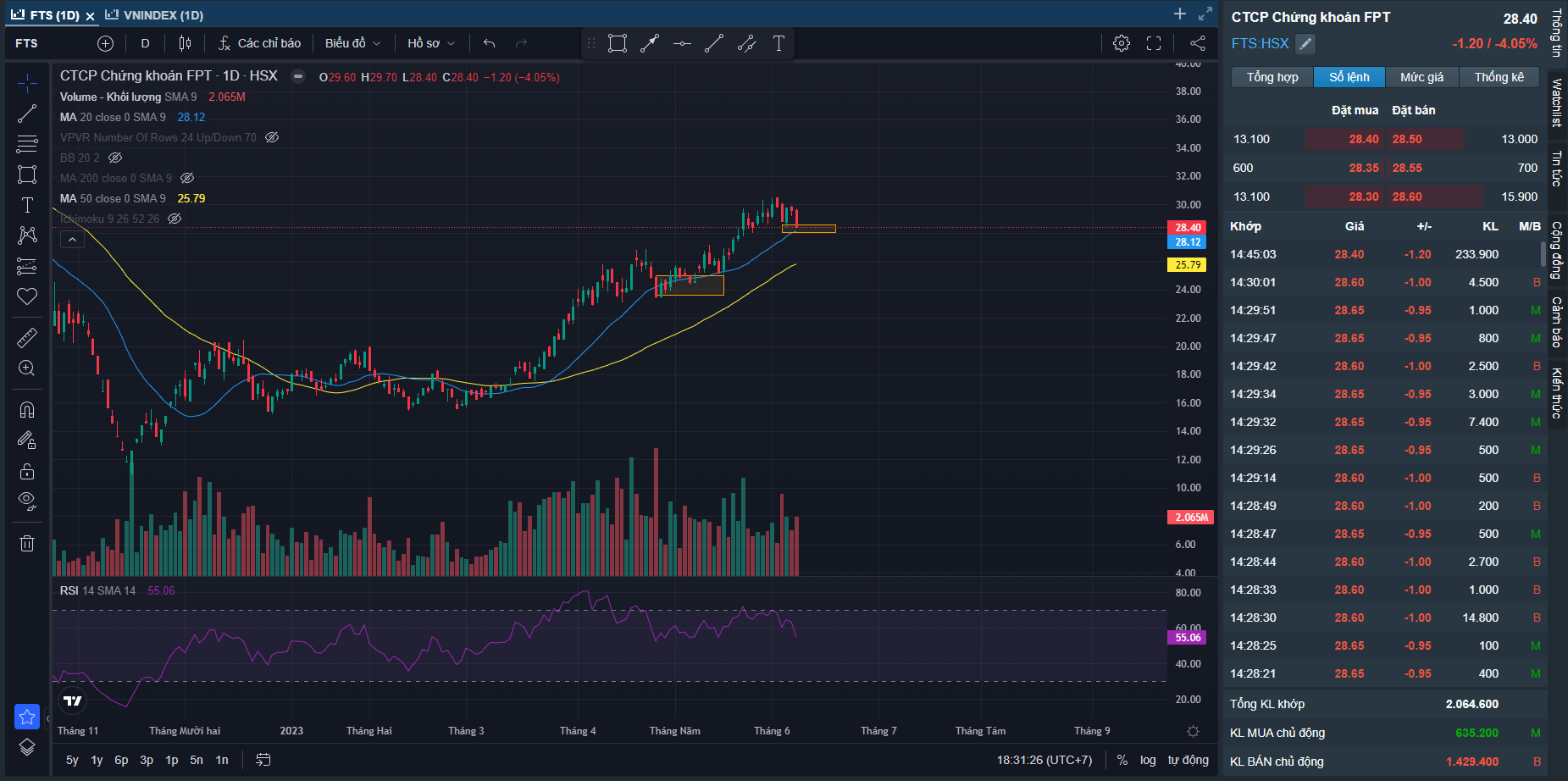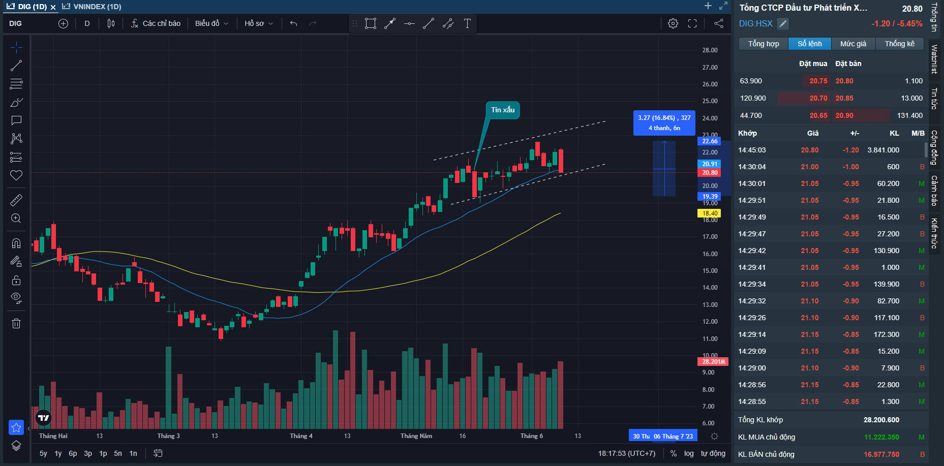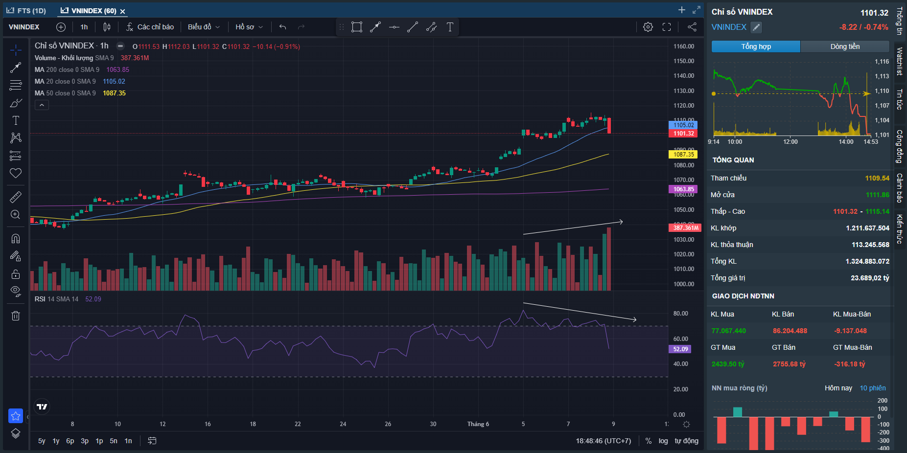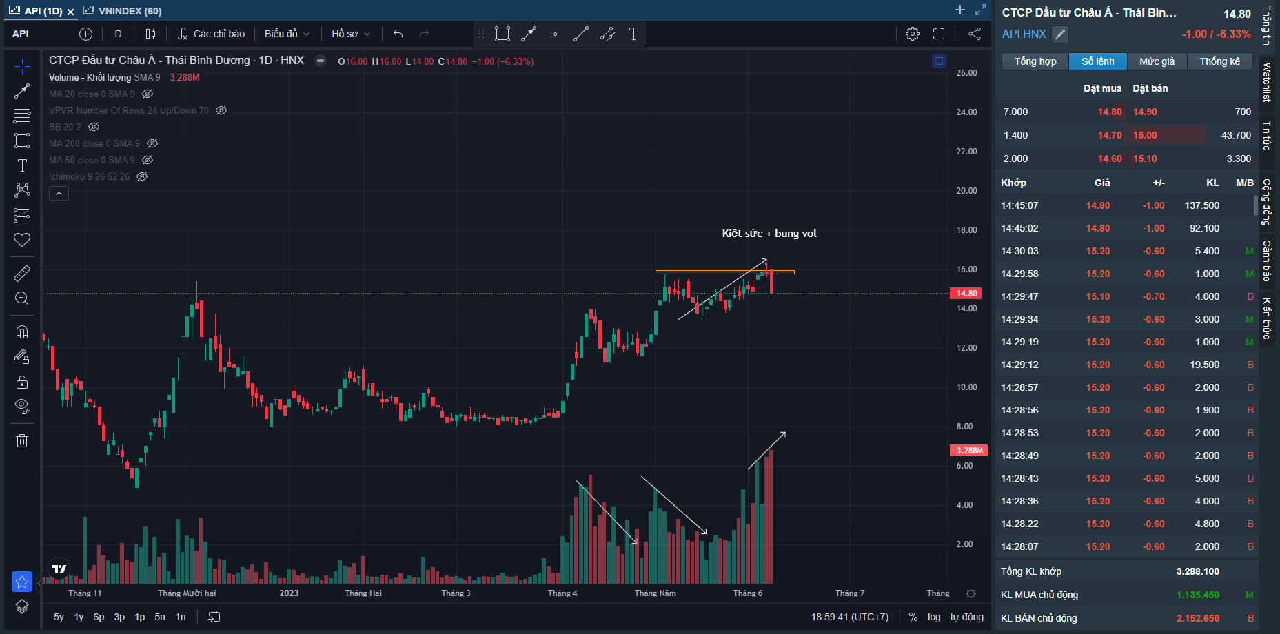 Rũ bỏ là điều cần thiết để tiếp tục đi lên, trong bối cảnh nhỏ lẻ mua mới rất nhiều trong giai đoạn vừa qua. Tuy nhiên điều tôi quan tâm là Khi Nhiều cổ phiếu đã xác nhận xu hướng tăng sau nên có phiên rung lắc không phải vấn đề quá lớn. Đoạn này trader nên dùng Ma20 làm hỗ trợ động để dùng làm mốc quản trị rủi ro.