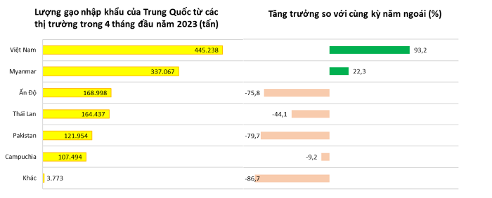 TQ nhập khẩu gạo từ Việt Nam lại tăng mạnh 93,2% về lượng và 116% về trị giá so với cùng kỳ năm ngoái, đạt 445.237 tấn với trị giá 260 triệu USD. Với kết quả này, Việt Nam đã vươn lên trở thành nước xuất khẩu gạo lớn nhất vào Trung Quốc trong 4 tháng đầu năm 2023, bỏ xa các thị trường khác như Myanmar, Ấn Độ hay Thái Lan.