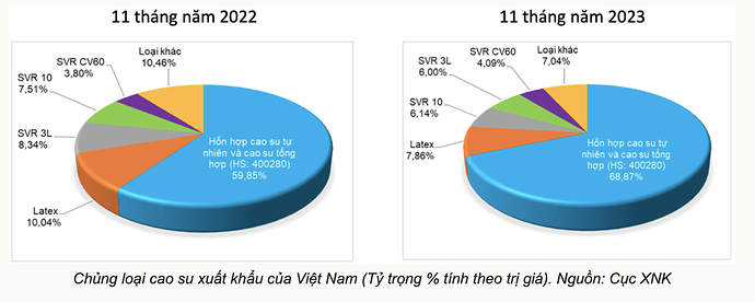 - Hỗn hợp cao su tự nhiên và cao su tổng hợp (HS 400280) vẫn là mặt hàng được xuất khẩu nhiều nhất, chiếm 67,57% về lượng và chiếm 68,98% về trị giá trong tổng xuất khẩu cao su của cả nước.