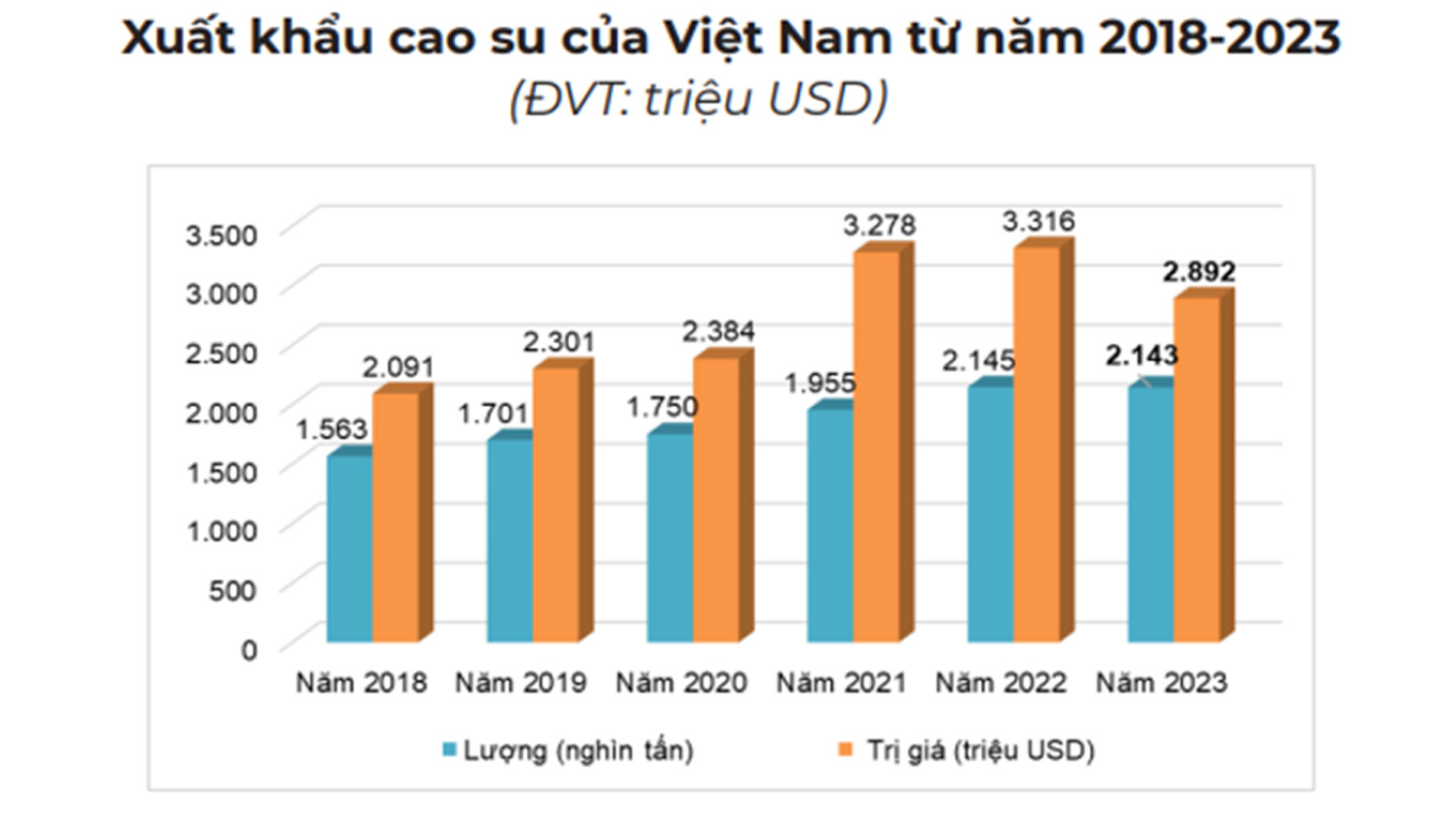 Dẫn số liệu từ Hải Quan, Bộ Nông nghiệp và Phát triển nông thôn cho hay năm 2023, Việt Nam xuất khẩu 2,14 triệu tấn cao su, kim ngạch 2,89 tỷ USD, giảm 0,1% về lượng và giảm 12,8% về trị giá so với năm 2022. Về giá xuất khẩu, giá cao su xuất khẩu năm 2023 giảm mạnh so với năm 2022, bình quân đạt 1.350 USD/tấn, giảm 12,7% so với mức giá bình quân xuất khẩu năm 2022.