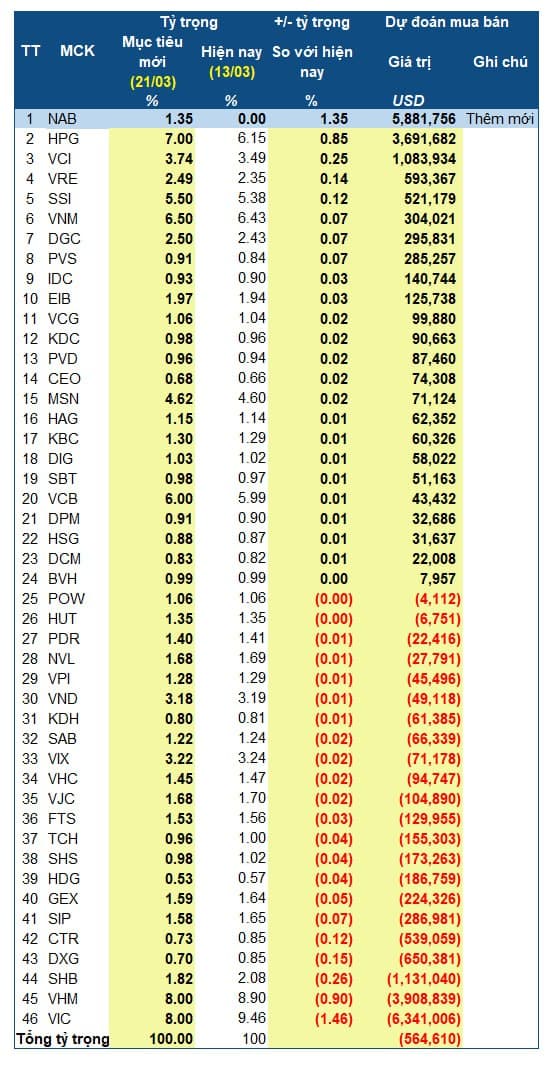 Trong đợt review quý 1/2025 công bố vào rạng sáng ngày 15/03/2025, MarketVector Indexes không loại mã cổ phiếu nào, chỉ bổ sung 1 mã cổ phiếu là NAB trong danh mục của MarketVector Vietnam Local Index - chỉ số tham chiếu cho quỹ trăm triệu đô VanEck Vectors Vietnam ETF (VNM ETF).