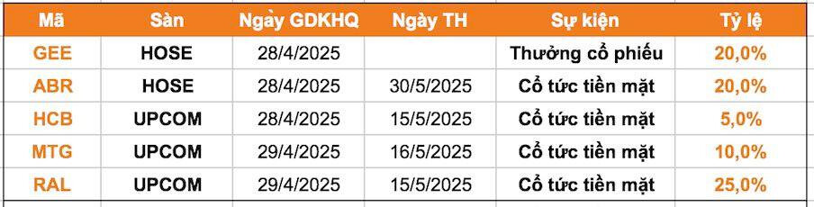 Lịch chốt quyền cổ tức 28/4-29/4: Cổ tức tiền mặt cao nhất 25%
