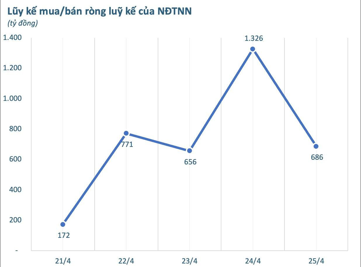 Trong tuần giao dịch từ ngày 21 đến 25/4/2025, nhà đầu tư nước ngoài đã mua ròng 686 tỷ đồng trên toàn thị trường, đánh dấu tuần đầu tiên mua ròng trong năm 2025. Cụ thể, khối ngoại mua ròng 588 tỷ đồng trên sàn HoSE, bán ròng 11 tỷ đồng trên HNX và mua ròng 109 tỷ đồng trên UPCoM. Các cổ phiếu được mua ròng mạnh nhất gồm HPG (514,1 tỷ đồng), MWG (337,9 tỷ đồng) và STB (141,2 tỷ đồng). Ngược lại, FPT bị bán ròng mạnh nhất với 271,3 tỷ đồng, tiếp theo là HCM (158,4 tỷ đồng), FTS (156,5 tỷ đồng) và KBC (154,5 tỷ đồng).
