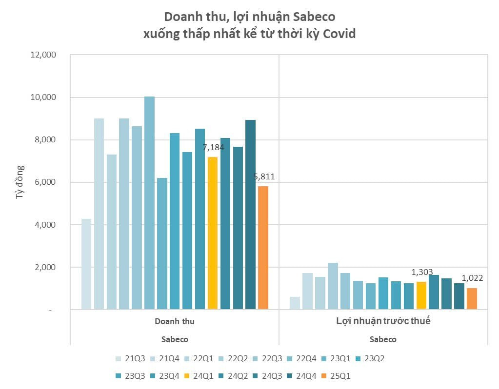 SAB: Doanh thu thuần đạt 5.811 tỷ đồng, lợi nhuận sau thuế đạt 1.022 tỷ đồng, lần lượt giảm 19% và 22% so với cùng kỳ. Doanh thu, lợi nhuận của doanh nghiệp này xuống thấp nhất kể từ thời kỳ dịch Covid tới nay.