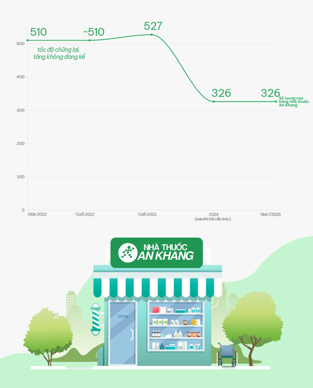 Chuỗi nhà thuốc An Khang, thuộc sở hữu của Thế Giới Di Động (MWG), từng đặt mục tiêu mở rộng lên 2.000 cửa hàng toàn quốc vào cuối năm 2023. Tuy nhiên, đến quý I/2025, số lượng cửa hàng chỉ còn 326, với toàn bộ điểm bán tại Hà Nội đã đóng cửa. Nguyên nhân chính là hiệu quả kinh doanh không đạt kỳ vọng, khi doanh thu trung bình mỗi cửa hàng chỉ đạt 400–500 triệu đồng/tháng, thấp hơn mức hòa vốn ước tính 550 triệu đồng.