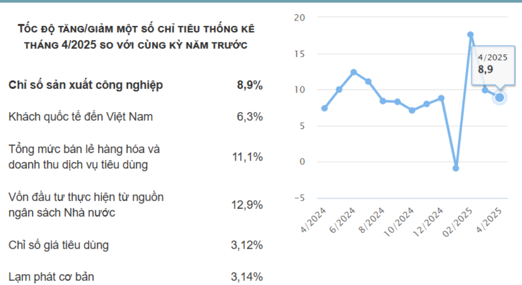 => Dữ liệu tiêu dùng đến cuối tháng 4 cho thấy tăng trưởng ở mức hai con số – một tín hiệu đáng mừng. Khi lạm phát ổn định quanh mức 3,2%, tăng trưởng thực của tiêu dùng có thể đã tiệm cận 8%, tương đương với tăng trưởng ngành sản xuất (8,4%). Như vậy, Việt Nam đang có xu hướng cân bằng hơn giữa sản xuất và tiêu dùng – trái ngược với mô hình “sản xuất nhanh, tiêu dùng chậm” như trước kia. Các số liệu tiêu dùng từ kỳ nghỉ lễ đầu tháng 5 cũng cho thấy chi tiêu và du lịch nội địa đều tăng đáng kể.