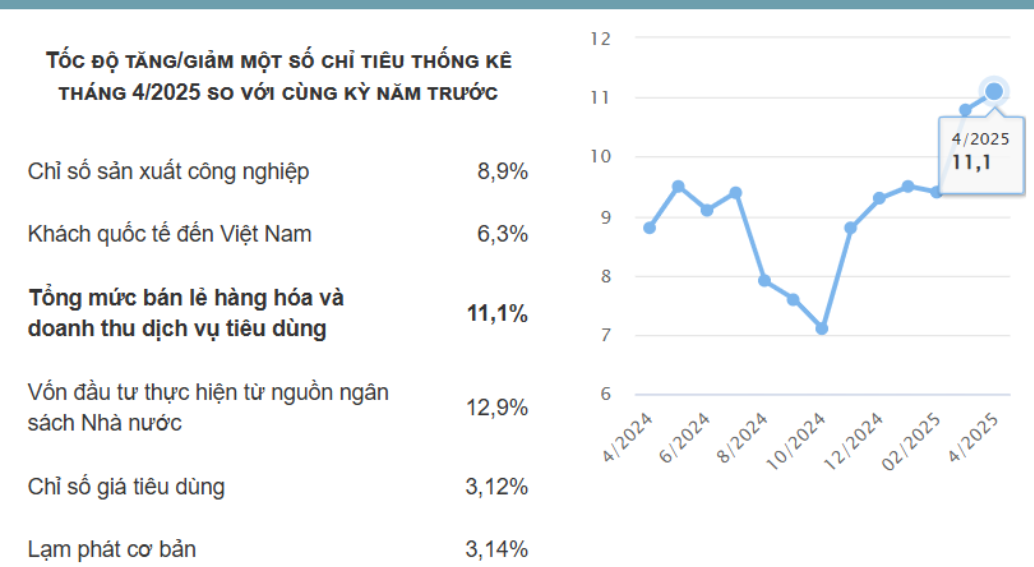 Tổng mức bán lẻ & DV tiêu dùng T4/2025: 582,1 nghìn tỷ VND, +11,1% YoY