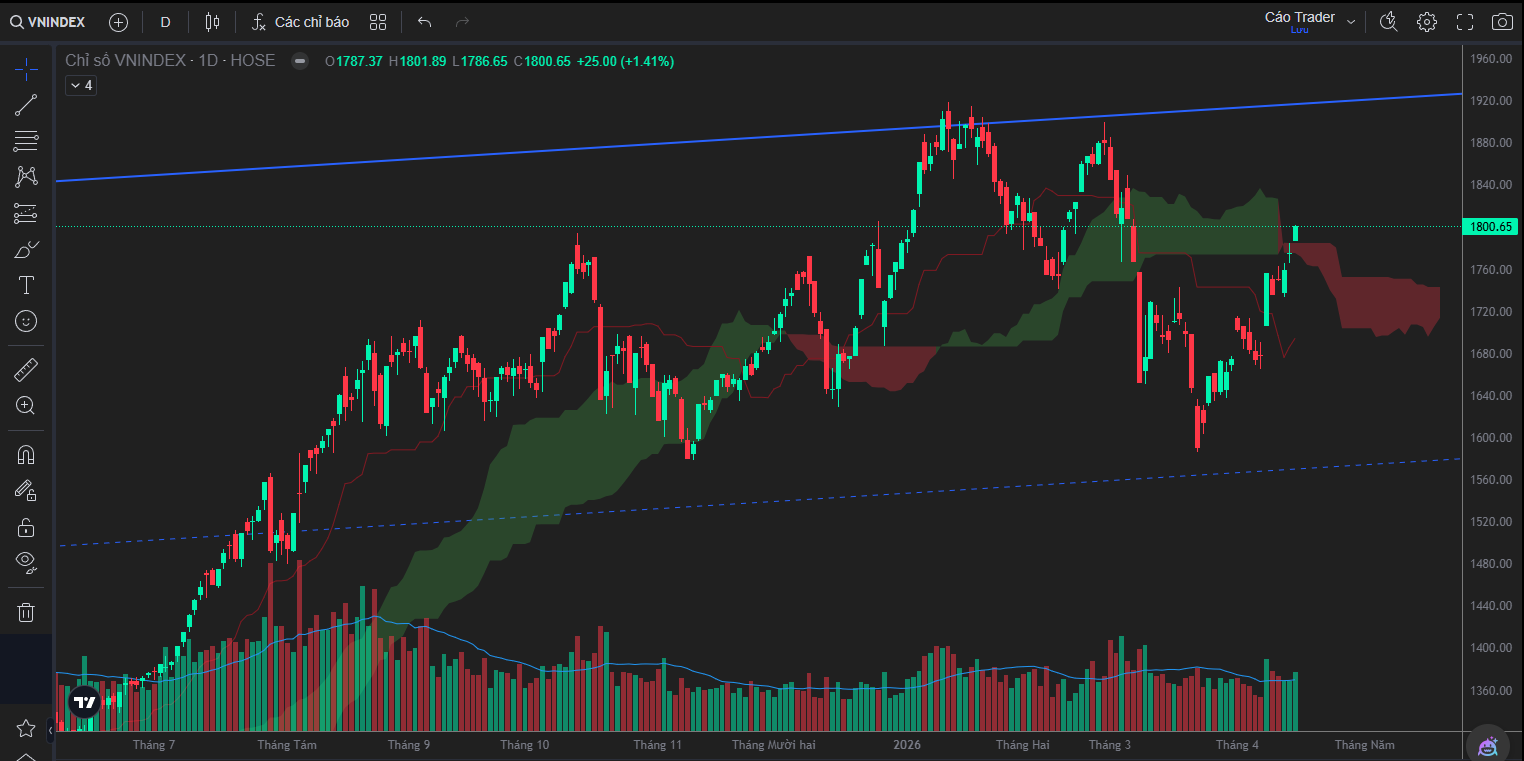 Trên khung D1, VN-Index đã bắt đầu tiến vào vùng mây Ichimoku, nhưng chưa hoàn toàn vượt lên phía trên. Đây là khu vực có ý nghĩa đặc biệt quan trọng, thường là ranh giới giữa xu hướng giảm và xu hướng trung tính/tăng. Tuy nhiên, cũng chính vì vậy mà đây là vùng dễ xuất hiện tín hiệu nhiễu nhất.