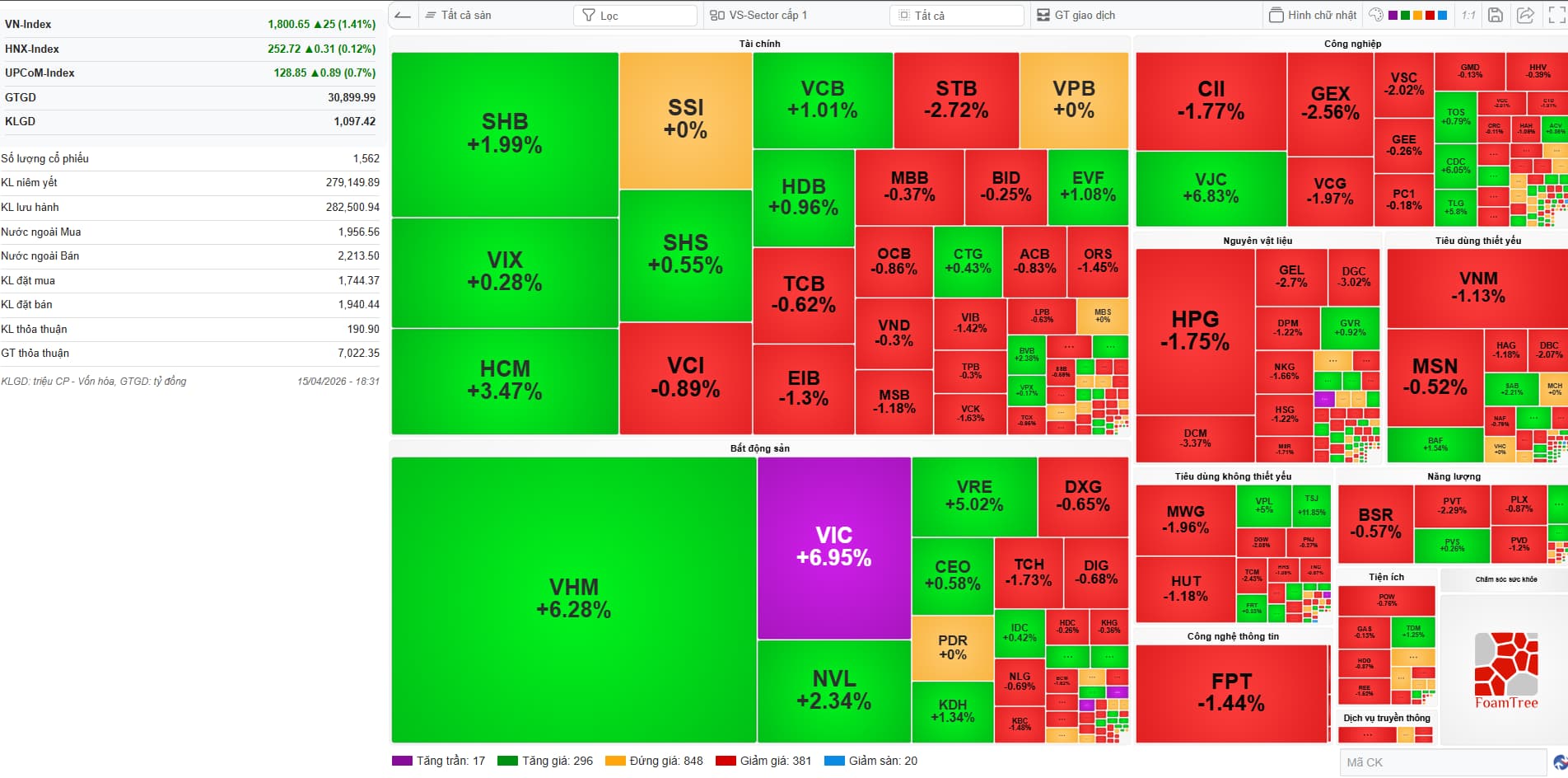 VN-Index đóng cửa tại 1,800 điểm (+1.41%), chính thức tiếp cận và vượt nhẹ vùng kháng cự quan trọng 1760–1780, thậm chí trong phiên có thời điểm chạm 1801 điểm. Về mặt điểm số, đây là một tín hiệu tích cực, cho thấy lực cầu vẫn đủ sức đẩy chỉ số lên vùng cao hơn. Tuy nhiên, điều cần đánh giá không phải là việc “đã vượt”, mà là chất lượng của cú vượt này.