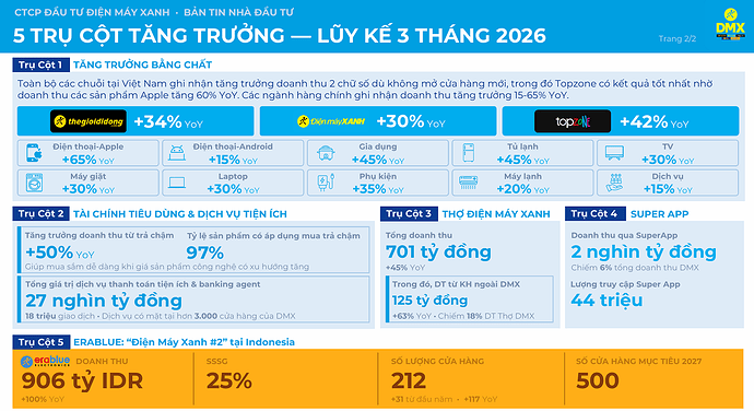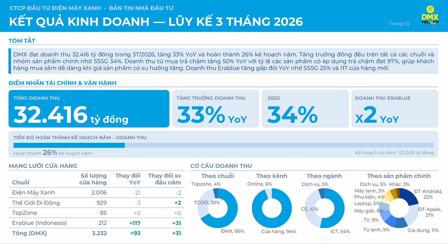 Nhìn tổng thể, kết quả lũy kế 3 tháng đầu năm 2026 của Điện Máy Xanh là khá tích cực. Doanh nghiệp không chỉ duy trì được mức tăng trưởng doanh thu cao, mà còn cho thấy chất lượng tăng trưởng tương đối tốt thông qua SSSG 34%, tăng trưởng đồng đều ở nhiều chuỗi, cải thiện doanh thu trên mỗi cửa hàng và mở rộng hiệu quả ở các trụ cột mới như tài chính tiêu dùng, dịch vụ, Super App và Erablue.