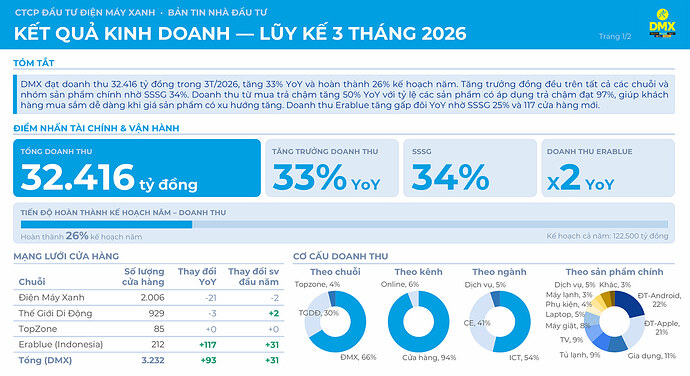 Với tiến độ hoàn thành 26% kế hoạch năm chỉ sau quý đầu tiên, cùng việc kết quả thực tế đang vượt dự báo, DMX đang có một nền khởi đầu tích cực cho năm 2026. Nếu sức mua tiếp tục được hỗ trợ bởi tài chính tiêu dùng, các nhóm hàng điện lạnh bước vào mùa cao điểm, và Erablue duy trì tốc độ mở rộng hiện tại, triển vọng tăng trưởng của hệ thống trong các quý tiếp theo vẫn tương đối khả quan.