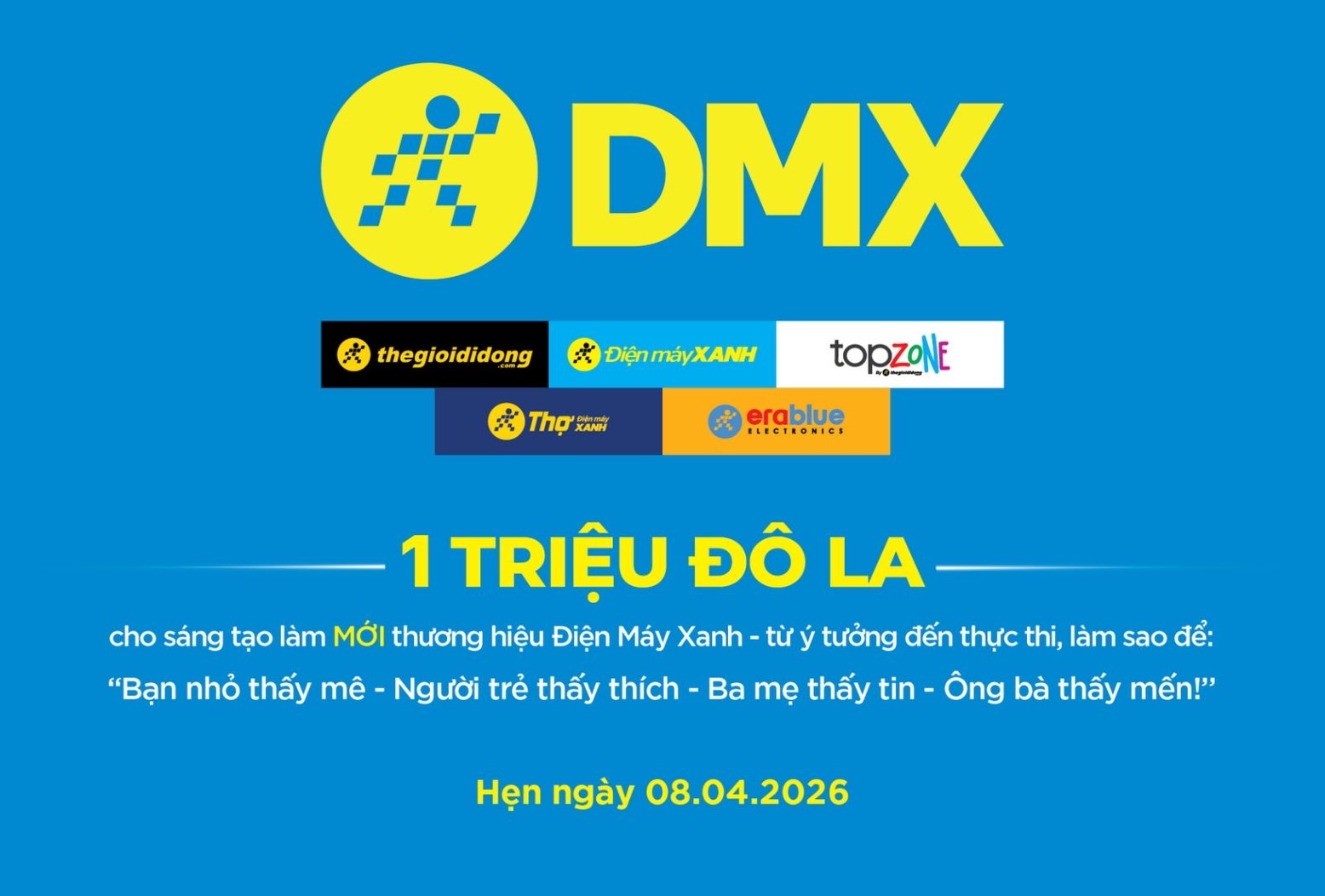 Mới đây, công ty cho biết sẽ dành ngân sách 1 triệu USD (tương đương khoảng 27 tỷ đồng) để kêu gọi cộng đồng sáng tạo và những người làm nội dung cùng tham gia giải bài toán làm mới thương hiệu. Lời mời mang đúng “chất” Điện Máy Xanh – vừa dí dỏm, gần gũi, vừa rõ ràng mục tiêu làm sao để: !Bạn nhỏ thấy mê – Người trẻ thấy thích – Ba mẹ thấy tin – Ông bà thấy mến!”