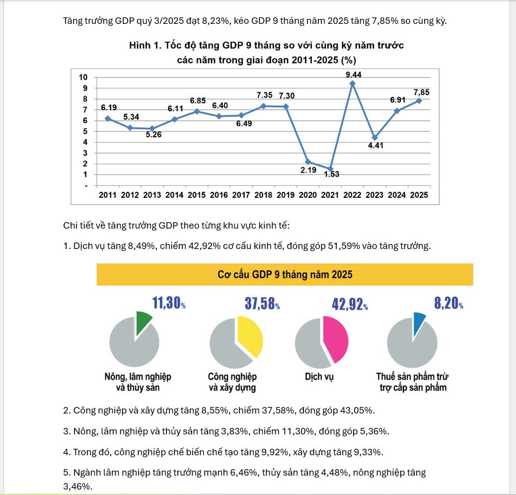Nhìn vào số liệu kinh tế vĩ mô 9 tháng của năm 2025. Có thể thấy nhóm Dịch vụ(tài chính-bán lẻ-tiêu dùng,…); công nghiệp chế biến chế tạo, xây dựng tiếp tục tăng trưởng mạnh so với cùng kỳ.