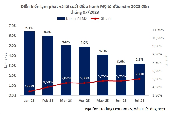 Theo chuyên gia kinh tế TS.Ngô Ngọc Quang - Đại học Ngân hàng TP.HCM, thống kê quá khứ từ năm 2001 đến tháng 7/2023 cho thấy, mức lạm phát Mỹ 3,2% tuy vẫn còn khá xa mục tiêu 2% của FED, song đây không phải là một con số quá đột biến và vẫn là một mức chấp nhận được. Bên cạnh đó, lạm phát lõi của quốc gia này vẫn đang giảm từ hồi đầu năm đến nay. Do đó, có thể FED sẽ không phải có những hành động quyết liệt thắt chặt tiền tệ như trước đây - điều đã từng khiến Ngân hàng Trung ương các nước khác, trong đó có Việt Nam, phải lo lắng.