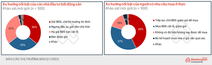 Xu hướng chung của nhà đầu tư và người mua BĐS đầu năm nay là chờ đợi và nghe ngóng. Báo cáo quý 1/2023 từ Batdongsan.com.vn cho thấy 43% người có nhu cầu mua ở thực đang tiếp tục chờ BĐS giảm giá, 65% nhà đầu tư đang giữ BĐS, chờ thị trường ổn định hoặc ngưng đầu tư, giữ tiền chờ thời.