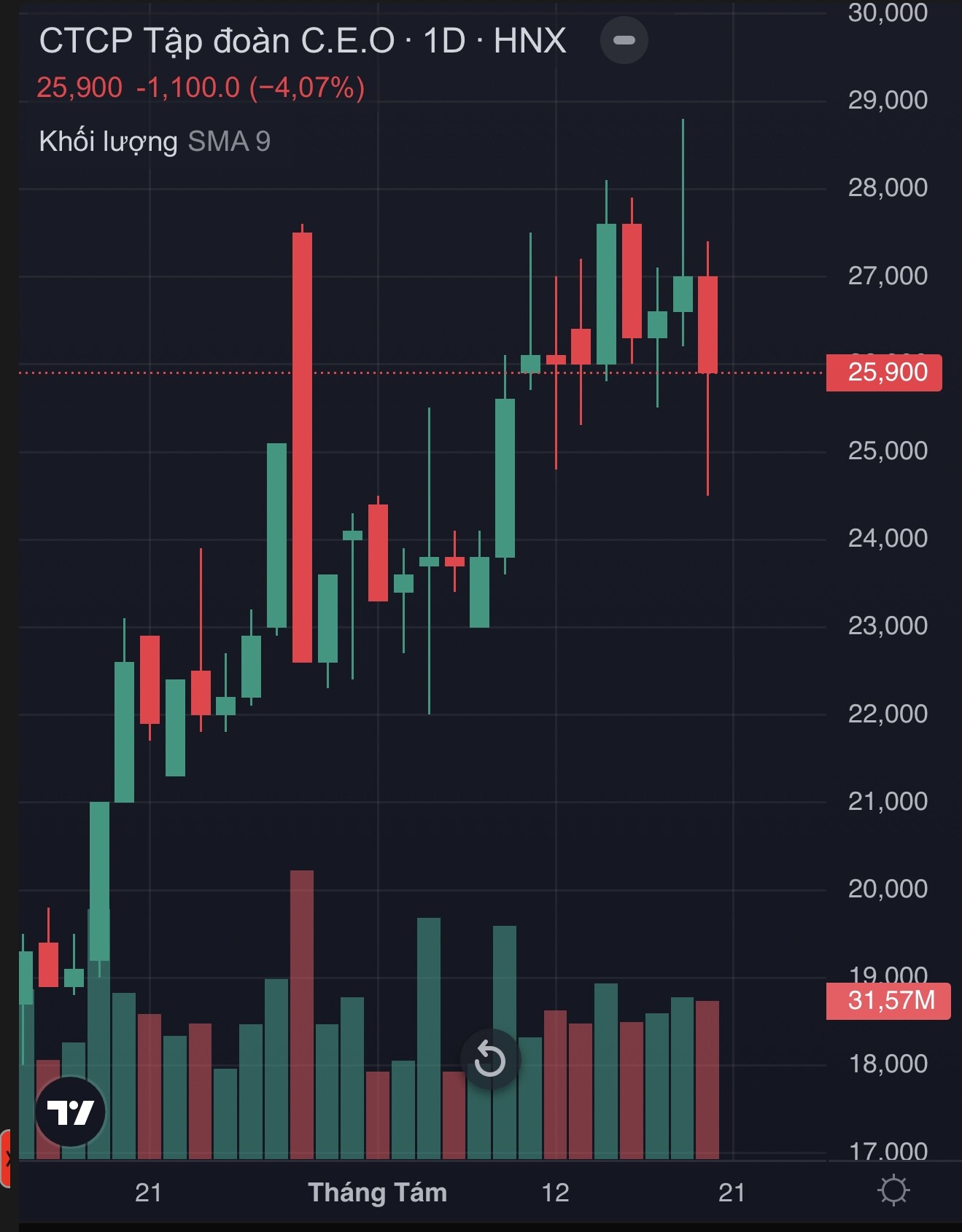 CEO hôm nay dù giảm mạnh -4,07% về 25.900, vẫn có vài điểm tích cực đáng chú ý: