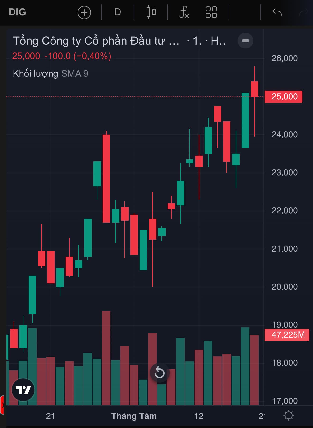 1. Giữ giá khá tốt sau nhịp tăng mạnh: Dù thị trường có rung lắc, DIG vẫn trụ vững quanh mốc 25.000 – đây là vùng kháng cự cũ và nay trở thành hỗ trợ tâm lý. Điều này cho thấy cổ phiếu chưa có áp lực bán tháo.