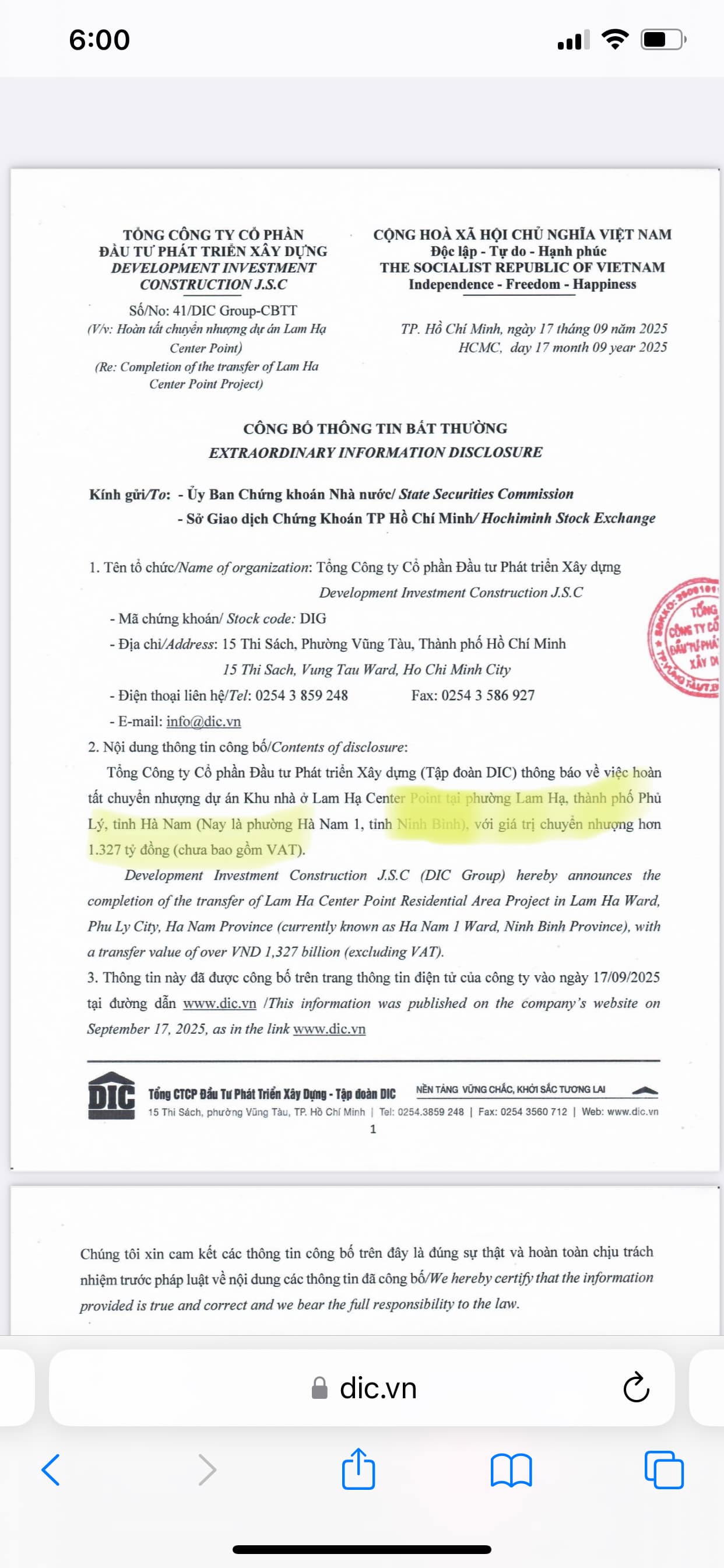 Cơ quan chức năng đã cho phép chuyển nhượng toàn bộ dự án Lam Hạ Center Point (vốn đầu tư hơn 2.115 tỷ đồng). Trung tâm Hội nghị Triển lãm Quốc tế Vũng Tàu được phê duyệt chuyển nhượng một phần dự án (Khối B). Trong nửa đầu năm 2025, DIC Corp cũng ghi nhận nhiều tiến triển về pháp lý dự án: Khu trung tâm Chí Linh được điều chỉnh tiến độ do chậm bàn giao đất; Chung cư A2-1 Chí Linh đã được nghiệm thu; tại Khu đô thị sinh thái Đại Phước, hồ sơ chuyển nhượng 2 khu đất (14 ha và 31 ha) cơ bản hoàn tất, Sở Xây dựng Đồng Nai đã kiến nghị UBND tỉnh báo cáo cấp thẩm quyền phê duyệt…